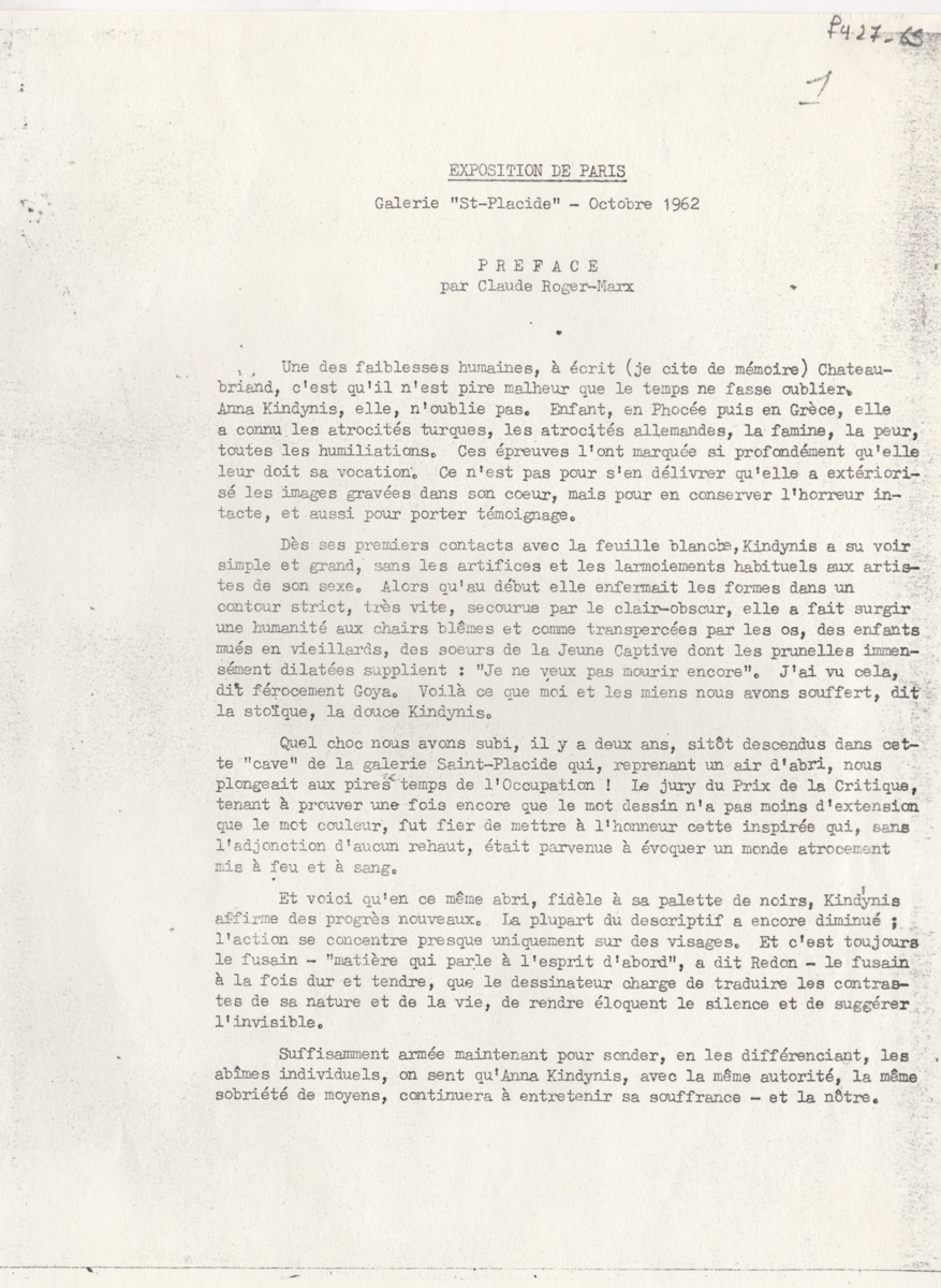 Φωτοαντίγραφο, χαρτί, 29×21 εκ., στα γαλλικά, καταλόγου έκθεσης της Άννας Κινδύνη, η οποία διεξάγεται στο Παρίσι τον Οκτώβρη 1962. Δίνονται βιογραφικές πληροφορίες ενώ ασκείται κριτική για το έργο που παρουσιάζεται.