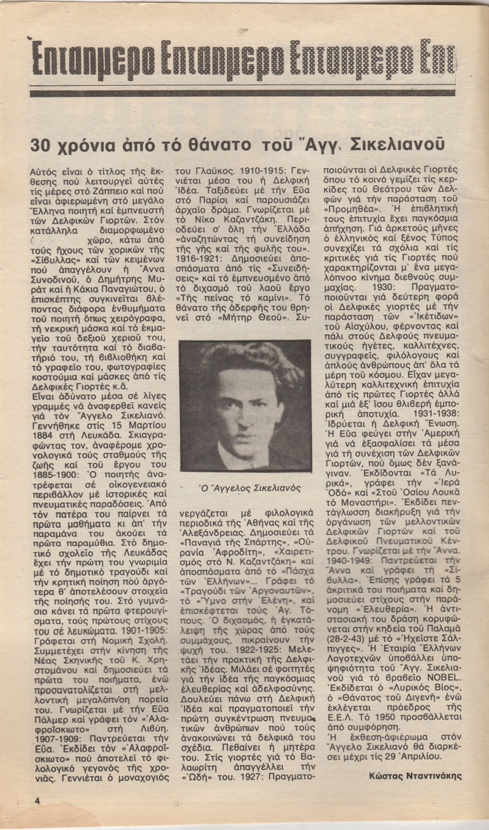Κείμενο/άρθρο, χαρτί, 22×13,5 εκ., στα ελληνικά, αφιερωμένο στα 30 χρόνια από το θάνατο του Άγγελου Σικελιανού. Σχολιάζεται το ποιητικό του έργο και οι “Δελφικές Γιορτές”, που διοργάνωνε με την υποστήριξη της συζύγου του Εύας. Εικονογραφείται και εντάσσεται στη στήλη “Επταήμερο” του εντύπου.