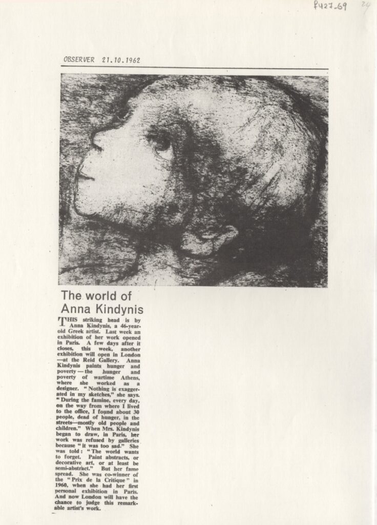 Φωτοαντίγραφο, χαρτί, 29×21 εκ., στα αγγλικά, δημοσίευσης κριτικής έκθεσης της Άννας Κινδύνη, η οποία διεξάγεται στην Reid Gallery στο Λονδίνο.