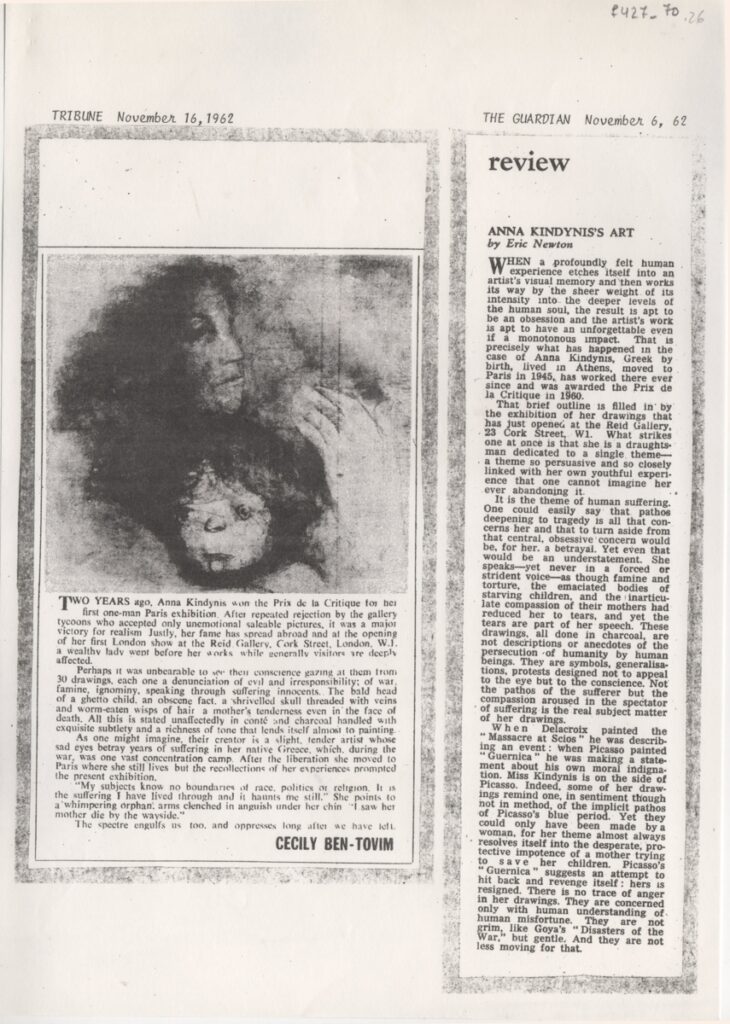 Φωτοαντίγραφο, χαρτί, 29×21 εκ., στα αγγλικά, δημοσίευσης κριτικής έκθεσης της Άννας Κινδύνη, η οποία διεξάγεται στην Reid Gallery, στο Λονδίνο και αναφέρεται στις δυστυχίες του πολέμου.