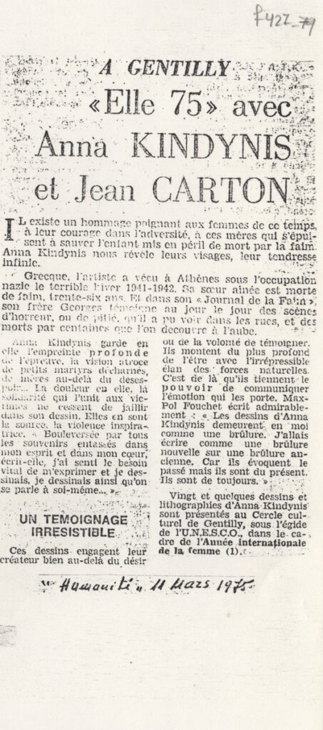 Φωτοαντίγραφο, χαρτί, 21×29 εκ., στα γαλλικά, δημοσίευσης κριτικής εκθέσεων των Άννας Κινδύνη και Jean Carton αφιερωμένες στη Γυναίκα. Το απόκομμα φέρει επιγραφές.