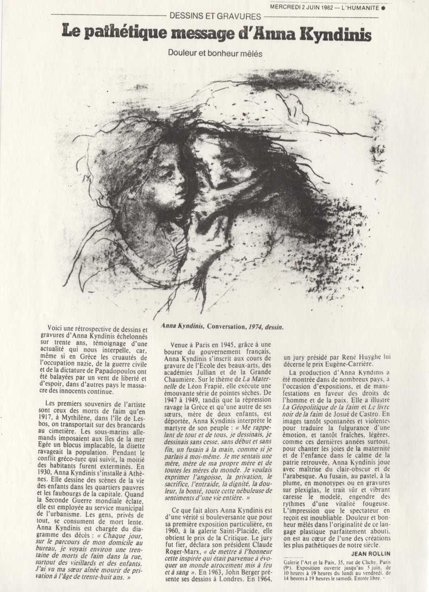 Φωτοαντίγραφο, χαρτί, 29×21 εκ., στα γαλλικά, δημοσίευσης κριτικής αναδρομικής έκθεσης της Άννας Κινδύνη στο Παρίσι. Το απόκομμα εικονογραφείται.