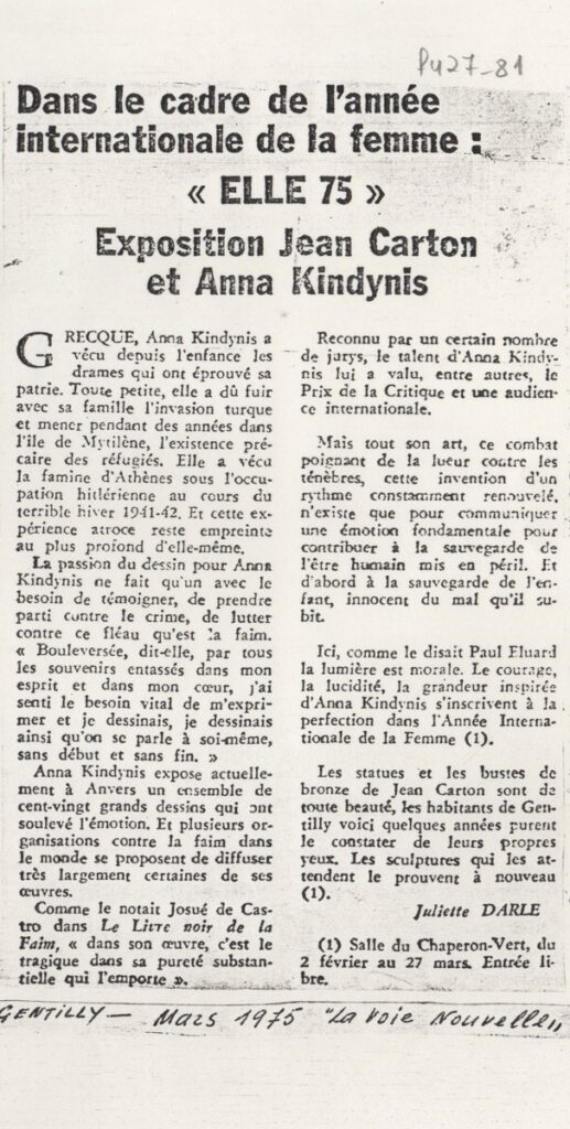 Φωτοαντίγραφο, χαρτί, 21×29 εκ., στα γαλλικά, δημοσίευσης κριτικής ομαδικής έκθεσης αφιερωμένης στη Γυναίκα, στην οποία συμμετέχουν με έργα τους οι Άννα Κινδύνη και Jean Carton. Το απόκομμα φέρει επιγραφές.
