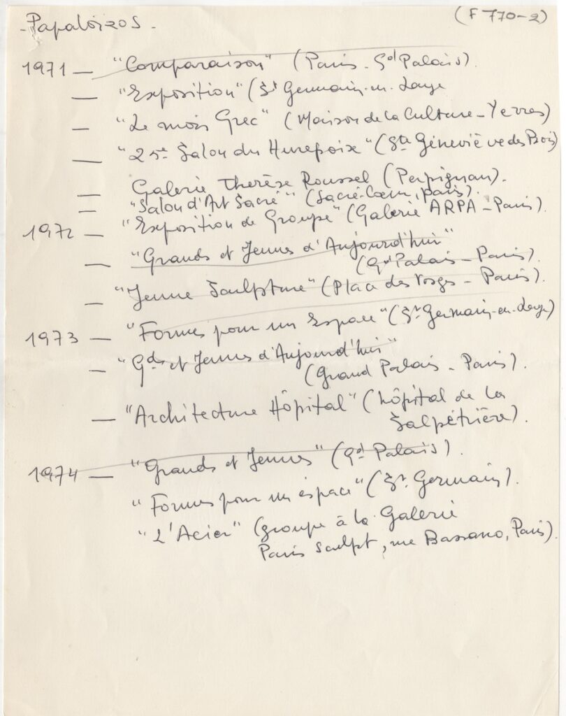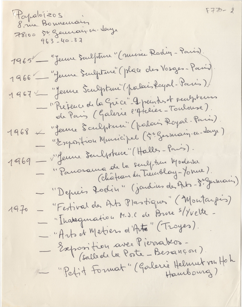 Βιογραφικό, χειρόγραφο με μαύρο μελάνι, χαρτί, 2 φφ, στα γαλλικά, 27×21 εκ., του Πέτρου Παπαλοϊζου. Περιέχει λίστα εκθέσεων του καλλιτέχνη.