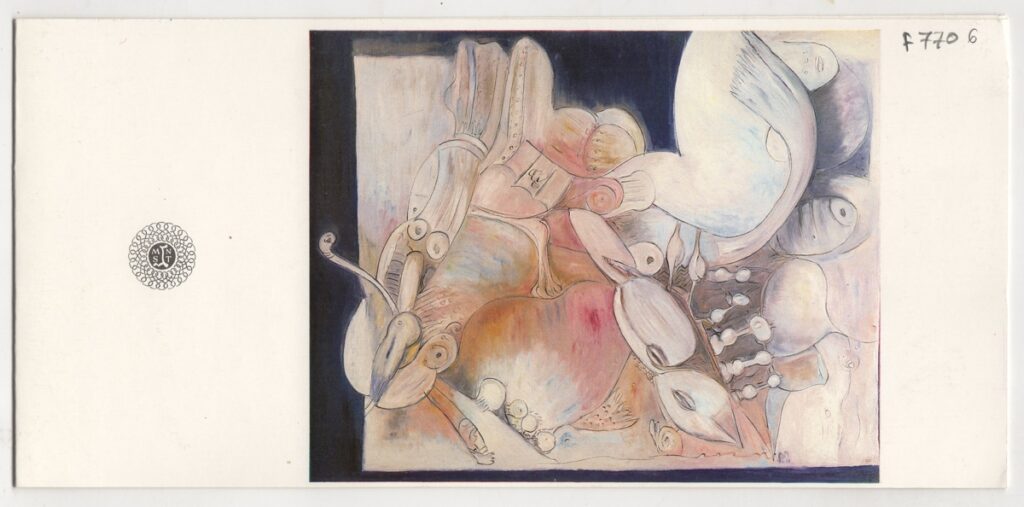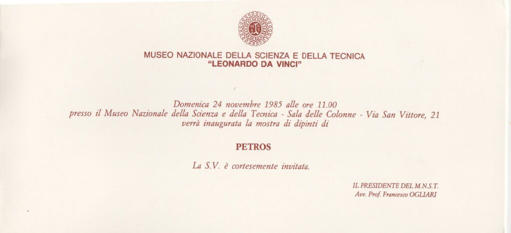 Πρόσκληση, χαρτόνι αναδιπλωμένο, 10,5×22,5 εκ., στα ιταλικά, εγκαινίων έκθεσης του Πέτρου Παπαλοΐζου στην Ιταλία.