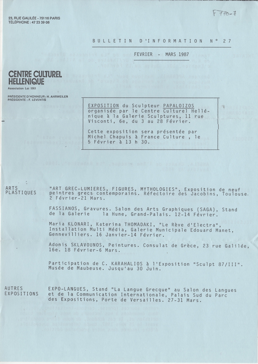 Έντυπο, δακτυλόγραφο, χαρτί, 30×21 εκ., στα γαλλικά, με αναγραφόμενες τις εκδηλώσεις που διοργανώνει το Ελληνικό Πολιτιστικό Κέντρο στη Γαλλία.