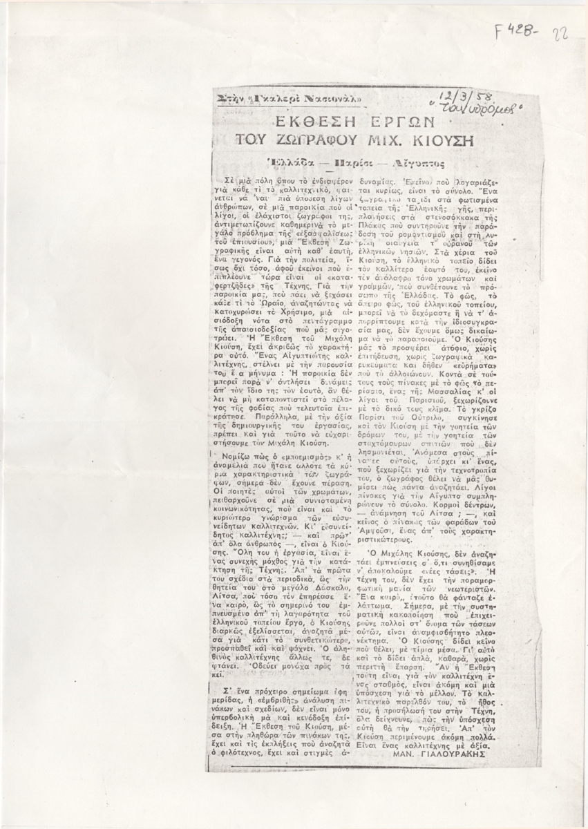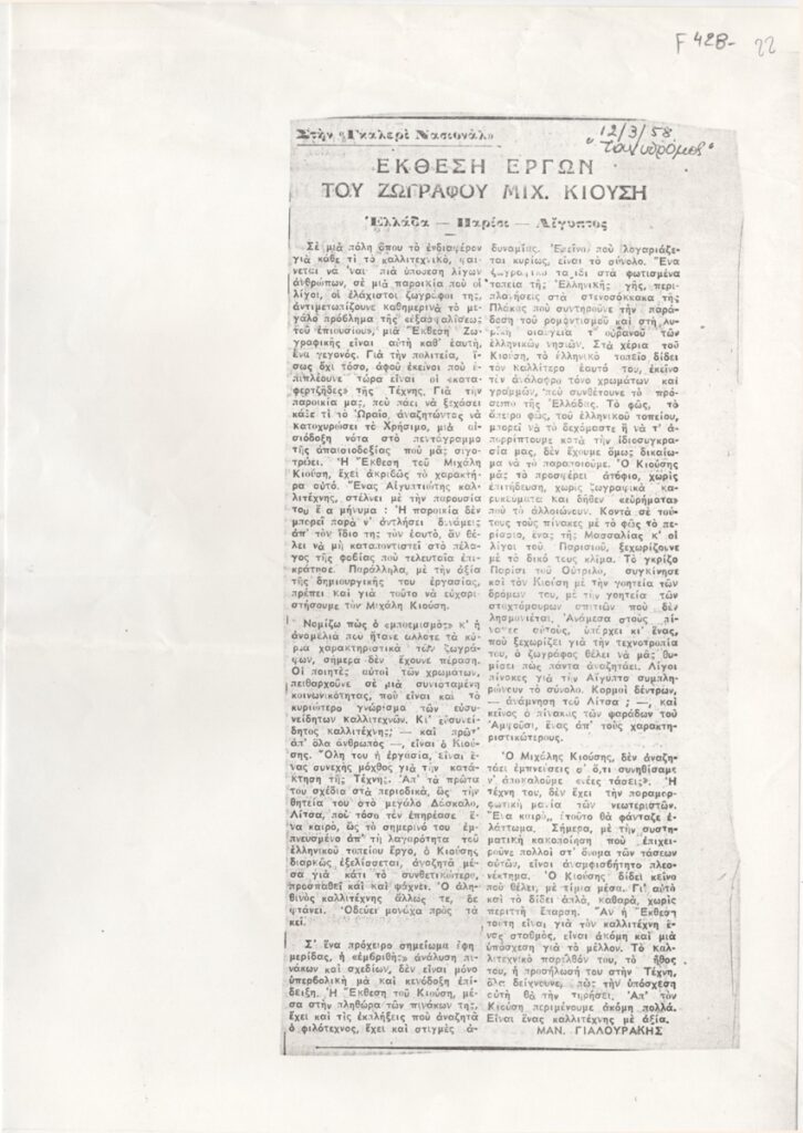 Φωτοαντίγραφο, χαρτί, 31×21 εκ., στα ελληνικά, δημοσίευσης άρθρου αναφερόμενου σε έκθεση του Μιχάλη Κιούση στην Αλεξάνδρεια. Σχολιάζεται το εικαστικό έργο και η καλλιτεχνική του πορεία.