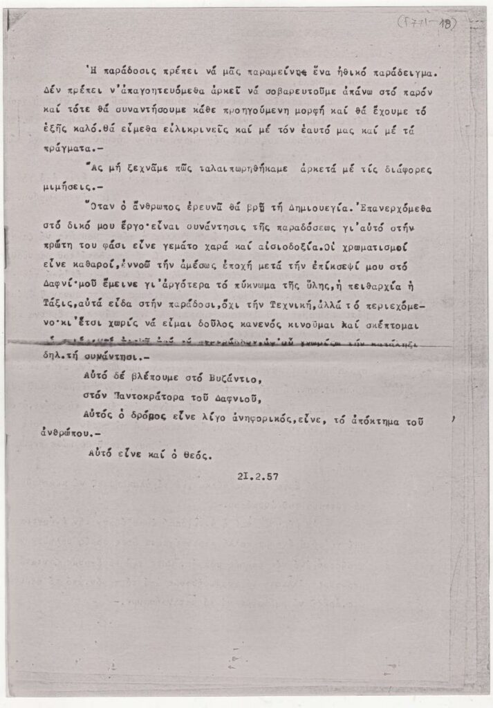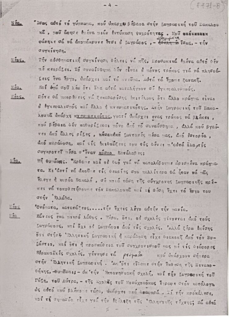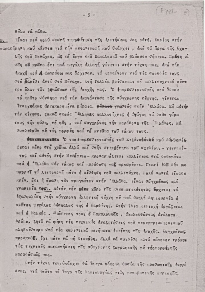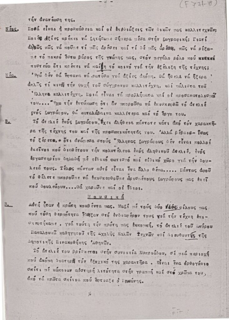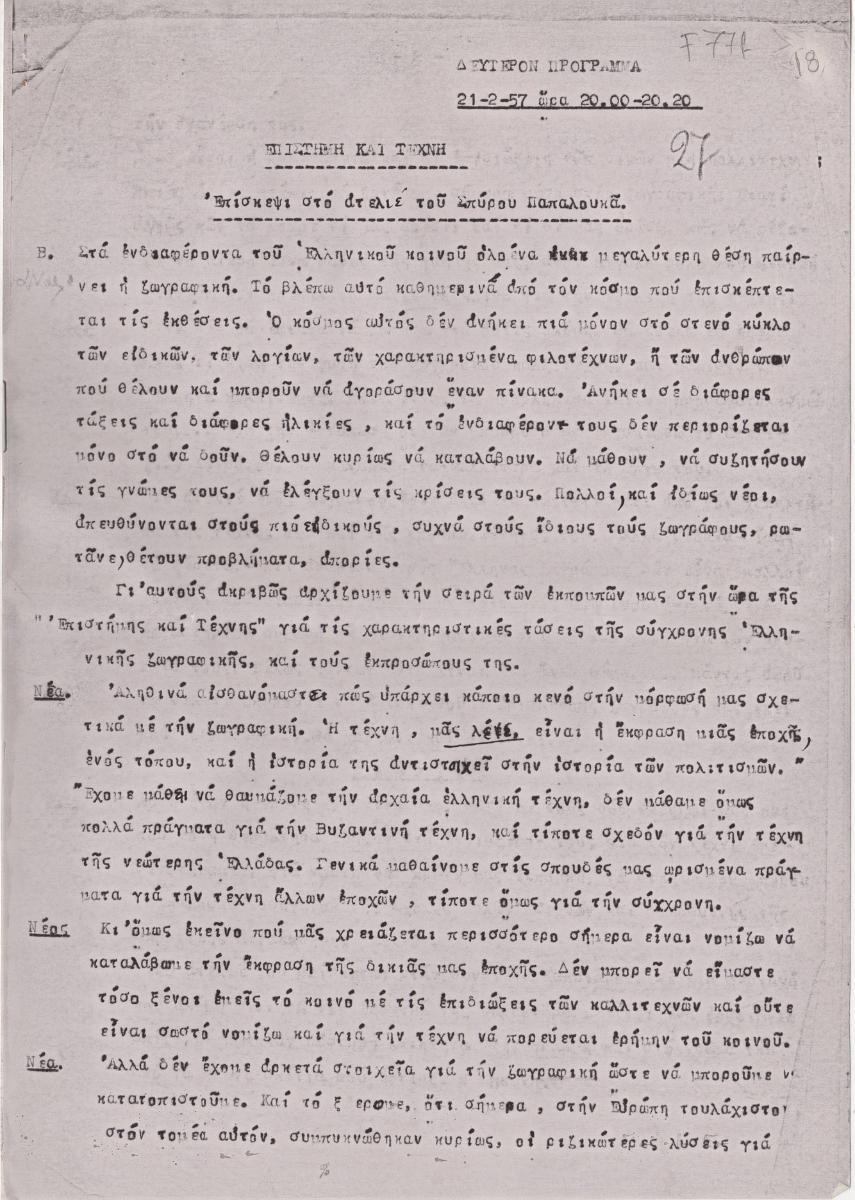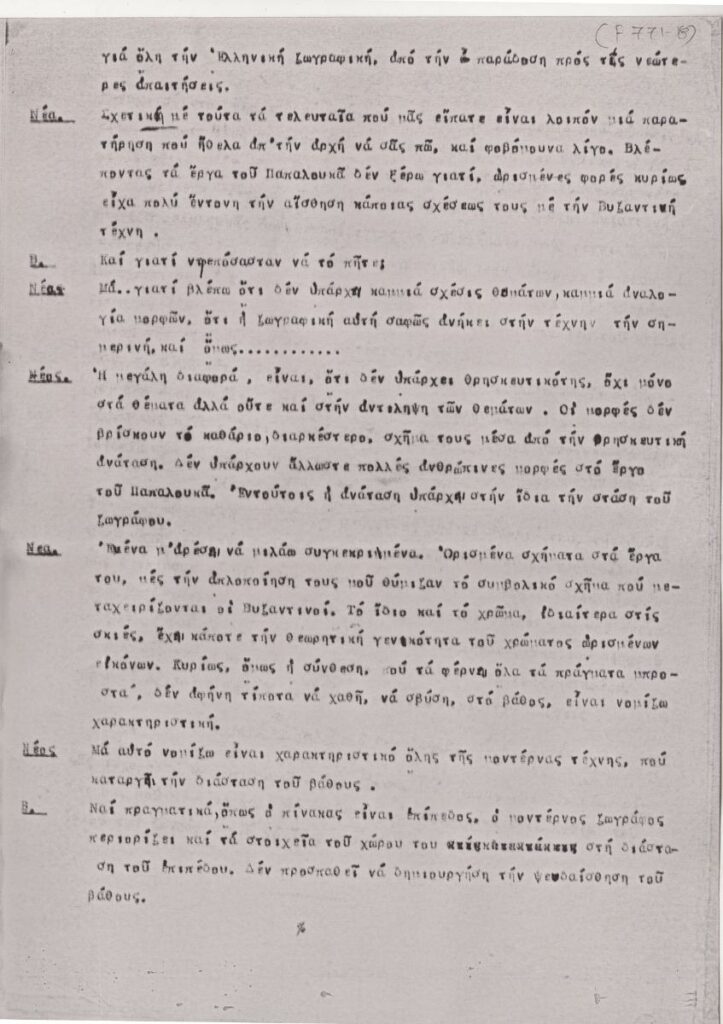 Δακτυλόγραφη απομαγνητοφώνηση ραδιοφωνικής εκπομπής του δευτέρου προγράμματος Αθηνών αφιερωμένης στον Σπύρο Παπαλουκά. Τίθενται ερωτήσεις από νέους προς την Ελένη Βακαλό, η οποία μιλάει διεξοδικά για το έργο του καλλιτέχνη. Επίσης, δίνεται απόσπασμα ομιλίας του στο πλαίσιο της εκπομπής, όπου εκφράζει τη χαρά του για το ενδιαφέρον των νέων για την Τέχνη του.