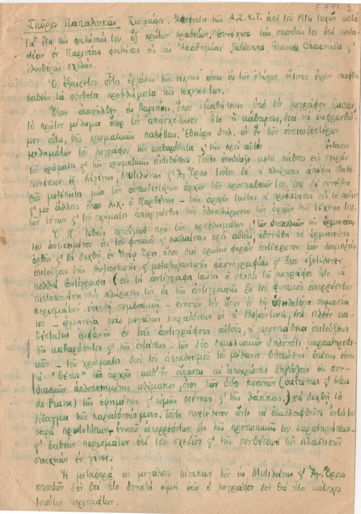 Βιογραφικό, χειρόγραφο με πράσινο μελάνι, ιδιόγραφο του Τώνη Σπητέρη, χαρτί, 6 φφ διπλής όψης, 30×21 εκ., στα ελληνικά. Δίνονται πληροφορίες για το εικαστικό του έργο. Στο ίδιο κείμενο, δίνονται αποσπάσματα δηλώσεων και σχολιάζεται το έργο των: Κράτη, Τρικογλίδη, Ηλιάδη, Καρτσωνάκη, Μάρθα, Ζευγώλη, Φαληρέα, Βασιλείου Σπ., Αστεριάδη, Απάρτη Αθ., Βιτσώρη, Γεωργιάδη Ανδρέα, Γουναρόπουλου, Κόντογλου και Εγγονόπουλου.