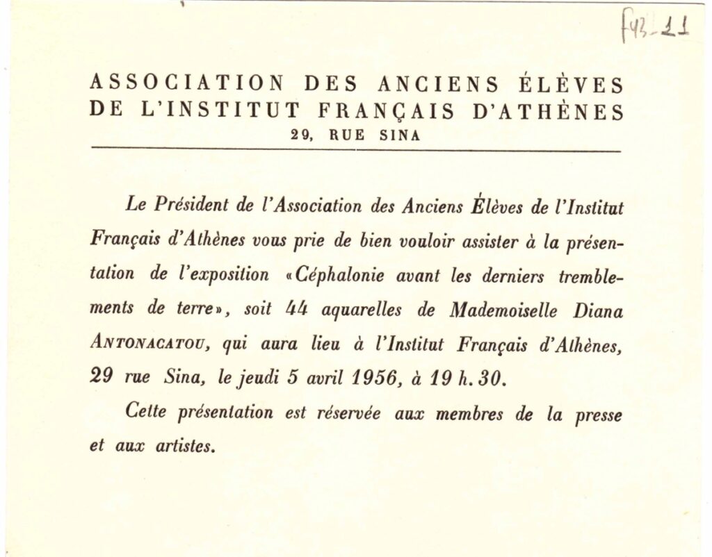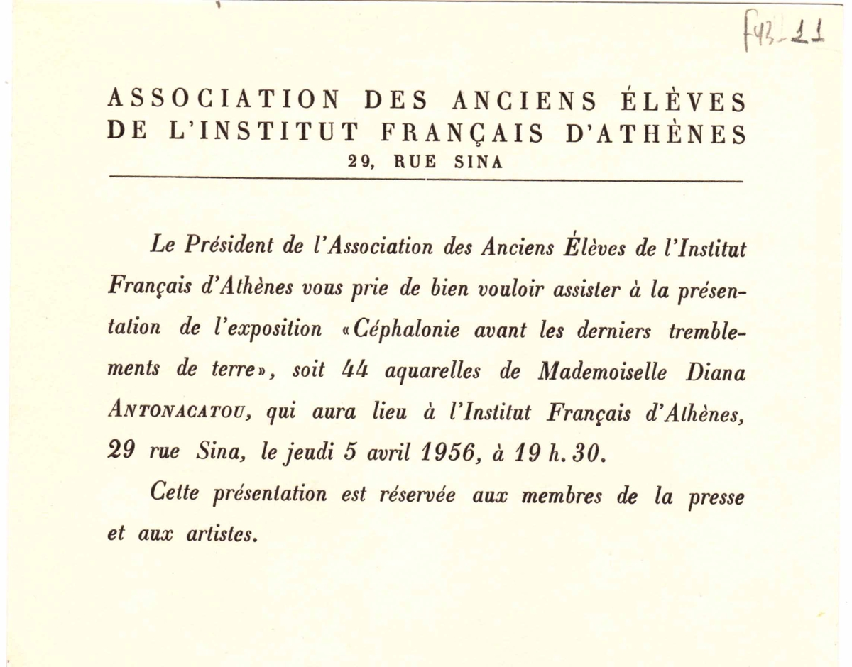 Πρόσκληση, χαρτόνι, 11,5×14εκ, στα γαλλικά, εγκαινίων έκθεσης της Ντιάνας Αντωνακάτου, για τους εκπροσώπους του Τύπου. Η έκθεση οργανώθηκε από τον Σύλλογο Αποφοίτων του Γαλλικού Ινστιτούτου Αθηνών.