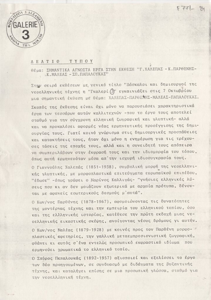 Φωτοαντίγραφο δελτίου Τύπου, χαρτί, 2 φφ, 30×21 εκ., στα ελληνικά, ομαδικής έκθεσης των Μαλέα, Χαλεπά, Παπαλουκά και Παρθένη. Δίνονται βιογραφικά των καλλιτεχνών και σημειώνεται η σημαντικότητα της έκθεσης εξαιτίας της πρωτοτυπίας των έργων που παρουσιάζονται.