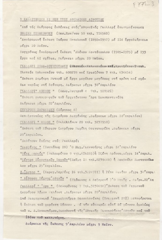 Κείμενο, δακτυλόγραφο, χαρτί, 33×21 εκ., στα ελληνικά, με αναφορά σε εκθέσεις της Αθήνας το 1976 των Σπύρου Παπαλουκά και Αλέκου Κοντόπουλου στην Εθνική Πινακοθήκη, Δημήτρη Μυταρά στην γκαλερί Ιόλα-Ζουμπουλάκη, Άρη Κωνσταντινίδη στην Αίθουσα Τέχνης Δεσμός, Διοχάντης στην Γκαλερί Σύγχρονη Χαρακτική, Μιχ. Φοινικαρίδη και Μ. Γιαννούρη στην γκαλερί Θόλος, Τζένης Δρόσου στην Γκαλερί Νέες Μορφές, Β. Κωστοπούλου στο Κέντρο Εικαστικών Τεχνών, Ρ. Νικήτα στην Γκαλερί Άστορ, Μηνά (Σεμερτζιάν) στην Αίθουσα Τέχνης Αθηνών και Χ. Μπλάουτ στο Καλλιτεχνικό Πνευματικό Κέντρο Ώρα. Ακόμη, σχολιάζεται μεταφορά έκθεσης του Τάσσου στη Θεσσαλονίκη και ομιλίες των Δ. Παπαστάμου και του ίδιου.