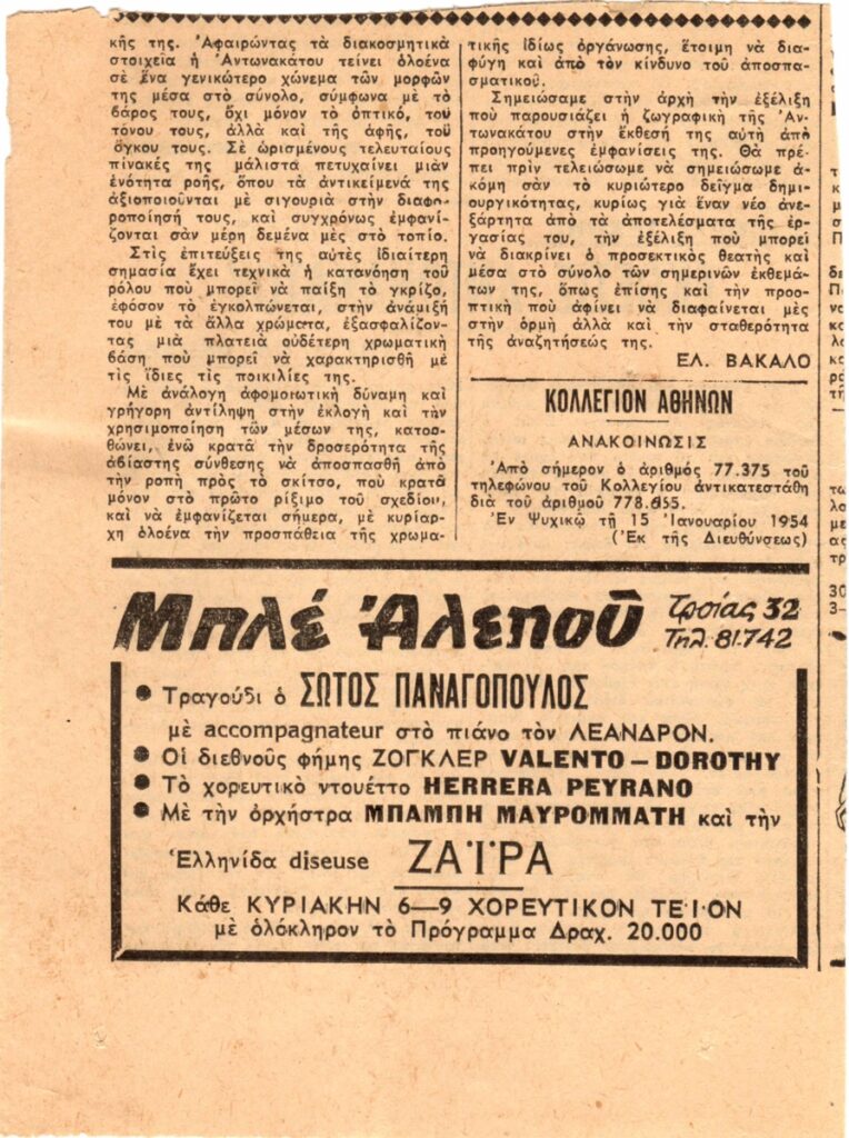 Απόκομμα, χαρτί δύο όψεων, 15×11,5εκ, στα ελληνικά, δημοσίευσης κριτικής της Ελένης Βακαλό για το έργο της Ντιάνας Αντωνακάτου.