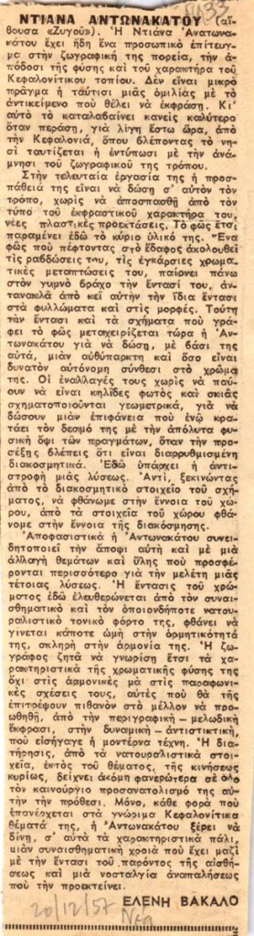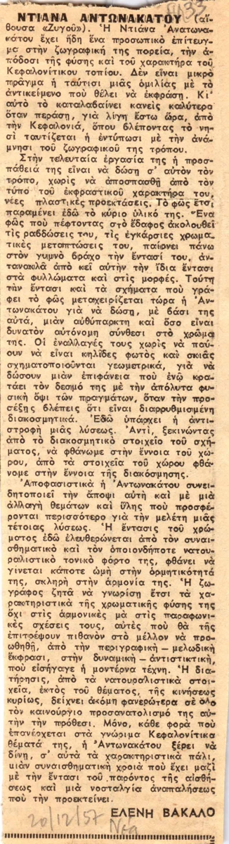 Απόκομμα, χαρτί, 18,5×5,5εκ, στα ελληνικά, δημοσίευσης κριτικής έκθεσης της Ντιάνας Αντωνακάτου στην Galerie Ζυγός στην Αθήνα.
