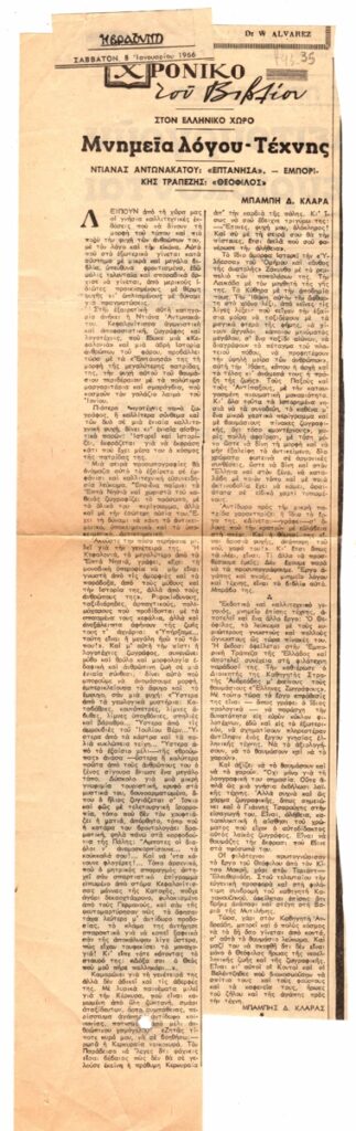 Απόκομμα, χαρτί, 42×13εκ, στα ελληνικά, δημοσίευσης άρθρου για την Ντιάνα Αντωνακάτου.