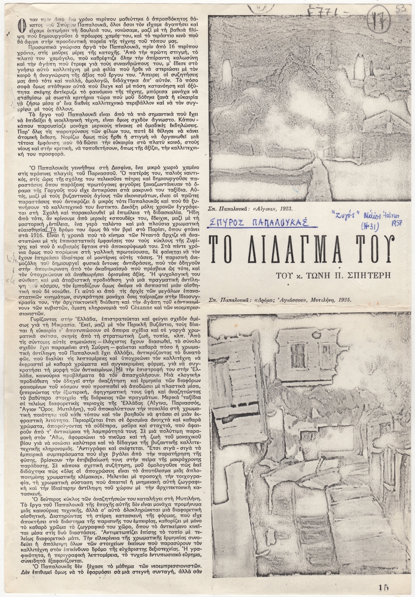 Φωτοαντίγραφο, χαρτί, 33×22 εκ., στα ελληνικά, δημοσίευσης άρθρου αναφερόμενου στη ζωή και στο εικαστικό έργο του Σπύρου Παπαλουκά.