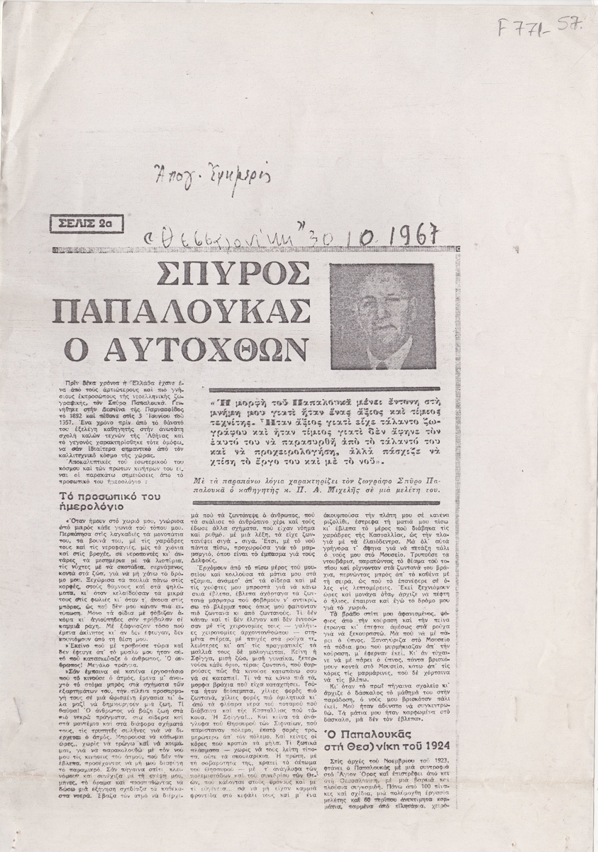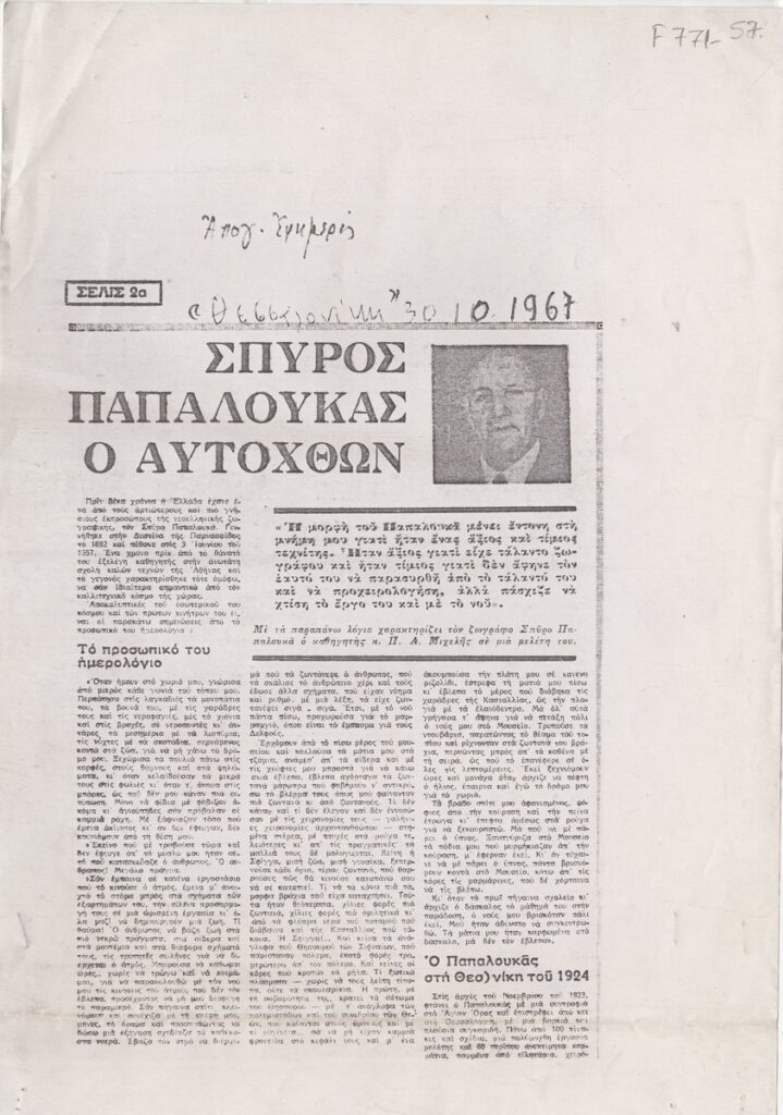 Φωτοαντίγραφο, χαρτί, 2 φφ, 30×21 εκ., στα ελληνικά, δημοσίευσης άρθρου για τον Σπύρο Παπαλουκά. Δίνονται αποσπάσματα από το προσωπικό ημερολόγιο του καλλιτέχνη και η εμπειρία του από την επίσκεψή του στη Θεσσαλονίκη και στο Άγιο Όρος το 1924.
