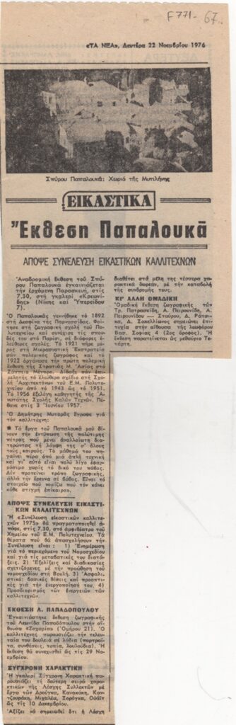 Απόκομμα, χαρτί, 34×11 εκ., στα ελληνικά, δημοσίευσης άρθρου αναφερόμενου στις εκθέσεις της περιόδου. Ειδικότερα, αναφέρεται αναδρομική έκθεση του Σπύρου Παπαλουκά στην γκαλερί Κρεωνίδης. Ακόμη γίνεται λόγος για την Συνέλευση Εικαστικών Καλλιτεχνών του 1975. Επίσης, αναφέρεται ατομική έκθεση του Λεωνίδα Παπαδόπουλου στην αίθουσα Ζαχαρία και ομαδικές της Λέσχης Συλλεκτών (έργα των Δρούγκα, Κανακάκη, Κατζουράκη, Σόρογκα, Μιχαλέα, Ουαϊτ) στην Γκαλερί Σύγχρονη Χαρακτική. Τέλος ομαδική των Πατρασκίδη, Πειρουνίδη και Πειρουνίδου, Ράτσικα και Σακελλίωνος.