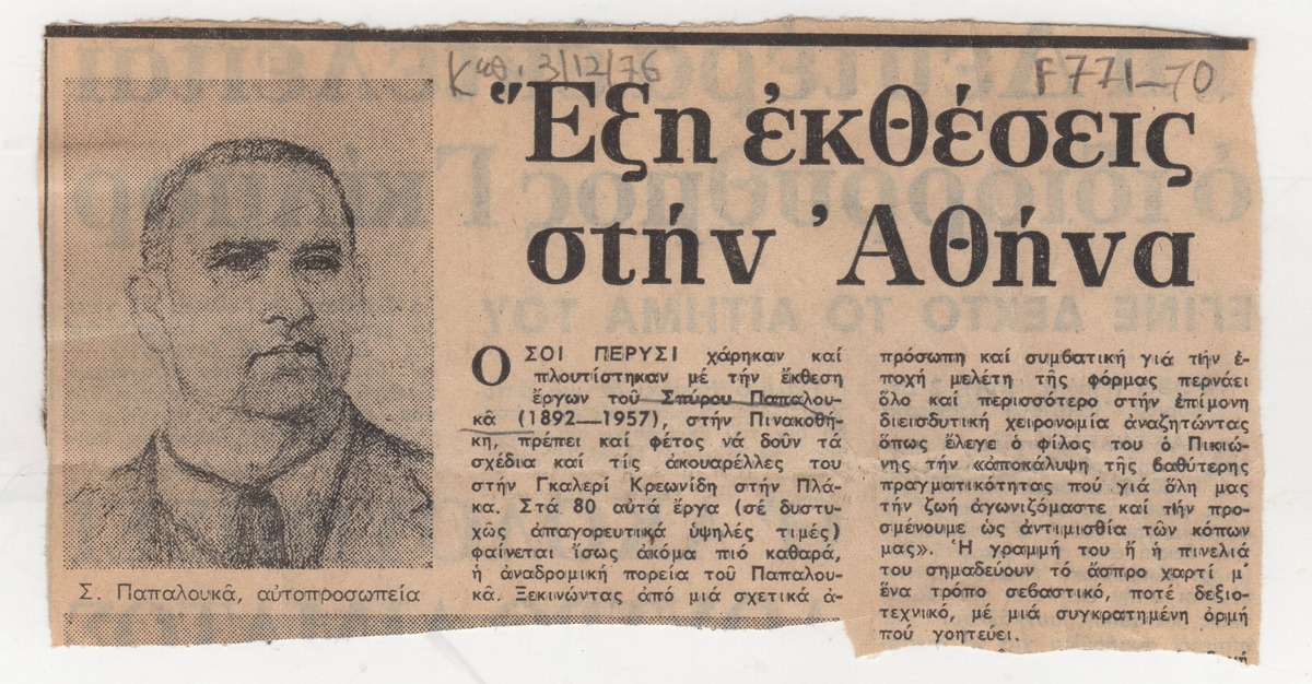 Απόκομμα της εφημερίδας “Η Καθημερινή” (03/12/1976) δημοσίευσης κριτικής έκθεσης του Σπύρου Παπαλουκά, η οποία διεξάγεται στην Γκαλερί Κρεωνίδης στην Αθήνα.