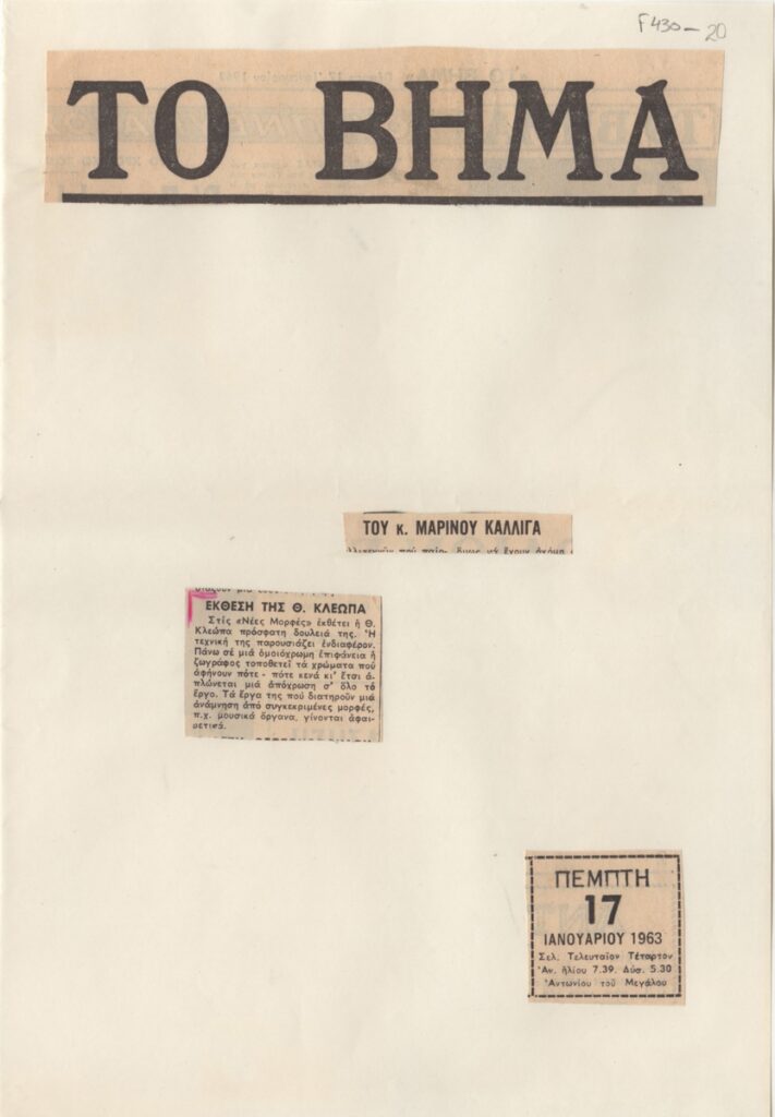 Χαρτί, 29×21 εκ., με κολλημένα αποκόμματα εντύπου, στα ελληνικά, δημοσίευσης κριτικής έκθεσης της Θάλειας Κλεώπα, η οποία διεξάγεται στην ΓΚαλερί Νέες Μορφές στην Αθήνα.