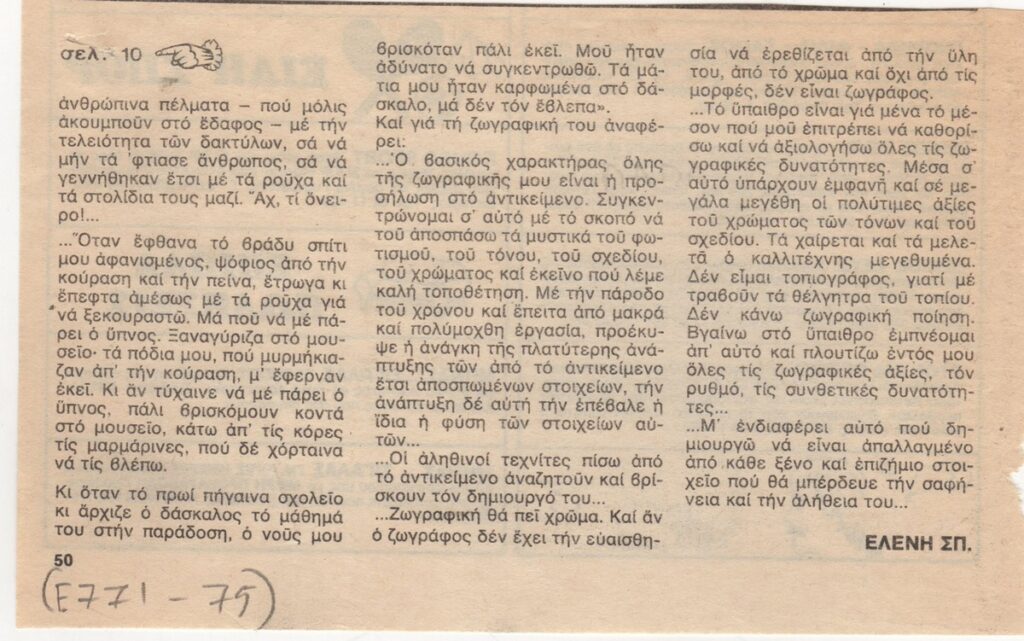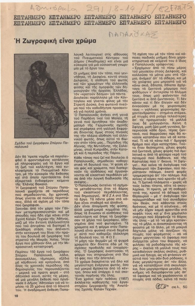 Απόκομμα του περιοδικού “Αθηνόραμα” (08/05/1982) δημοσίευσης κριτικής έκθεσης του Σπύρου Παπαλουκά, η οποία διεξάγεται στο Πνευματικό Κέντρο του Δήμου Αθηναίων. Δίνονται πληροφορίες για τα έργα που εκτίθενται ενώ σχολιάζεται η τεχνοτροπία και οι επιρροές του καλλιτέχνη.