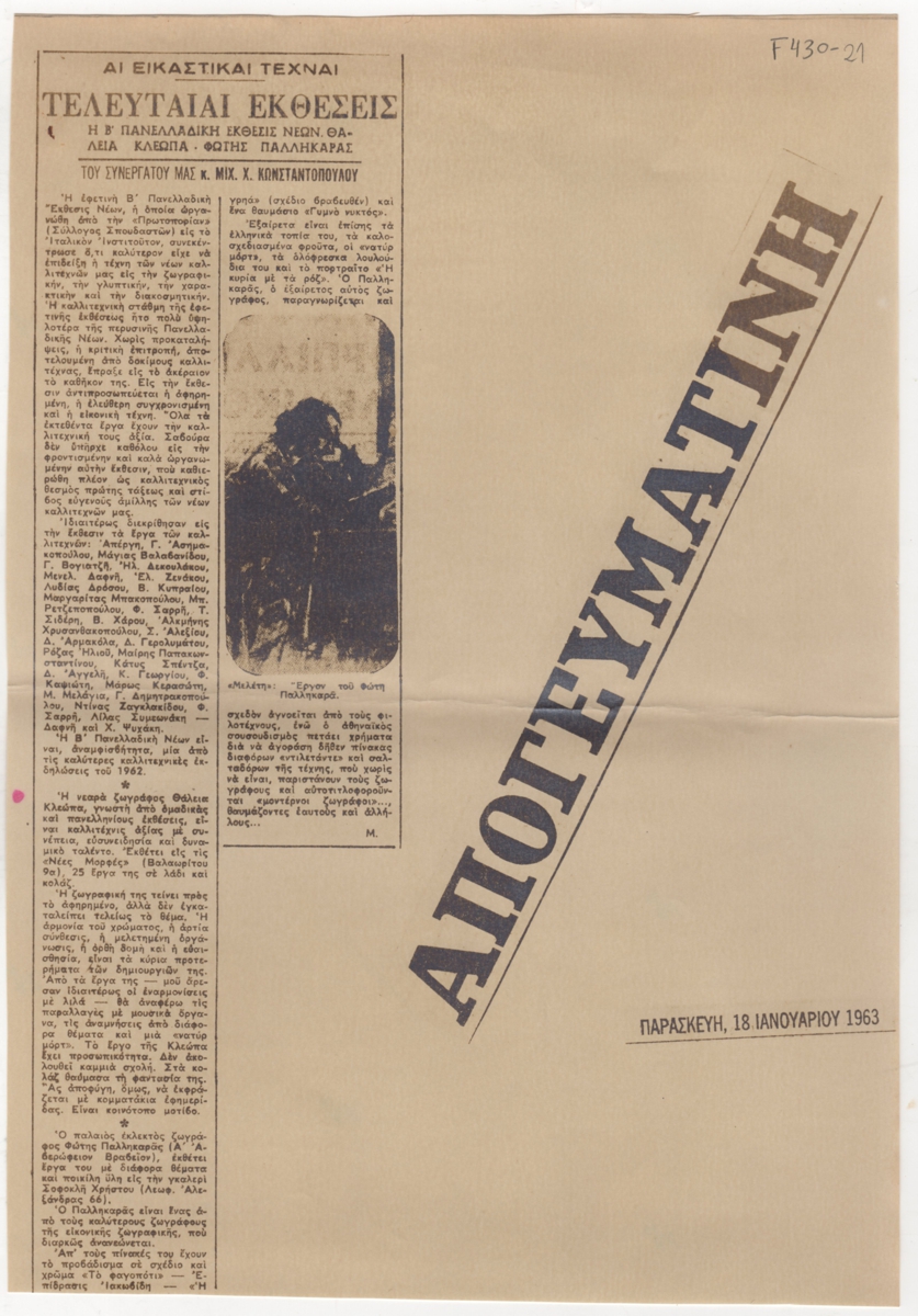 Φωτοαντίγραφο, χαρτί, 21,5×31 εκ., στα ελληνικά, δημοσίευσης κριτικής έκθεσης της Θάλειας Κλεώπα, η οποία διεξάγεται στην Γκαλερί Νέες Μορφές. Ομοίως, για την Πανελλήνια Έκθεση Νέων και την ατομική έκθεση του Φώτη Παλληκαρά στην γκαλερί Σοφοκλή Χρήστου.