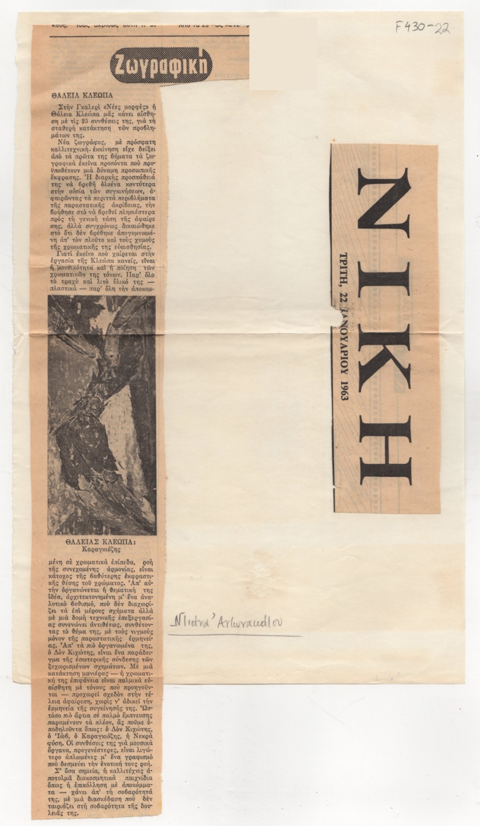 Χαρτί, 29×21 εκ., με κολλημένα αποκόμματα εντύπου, δημοσίευσης κριτικής έκθεσης της Θάλειας Κλεώπα, η οποία διεξάγεται στην γκαλερί Νέες Μορφές. Εντάσσεται στη στήλη “Ζωγραφική” του εντύπου.