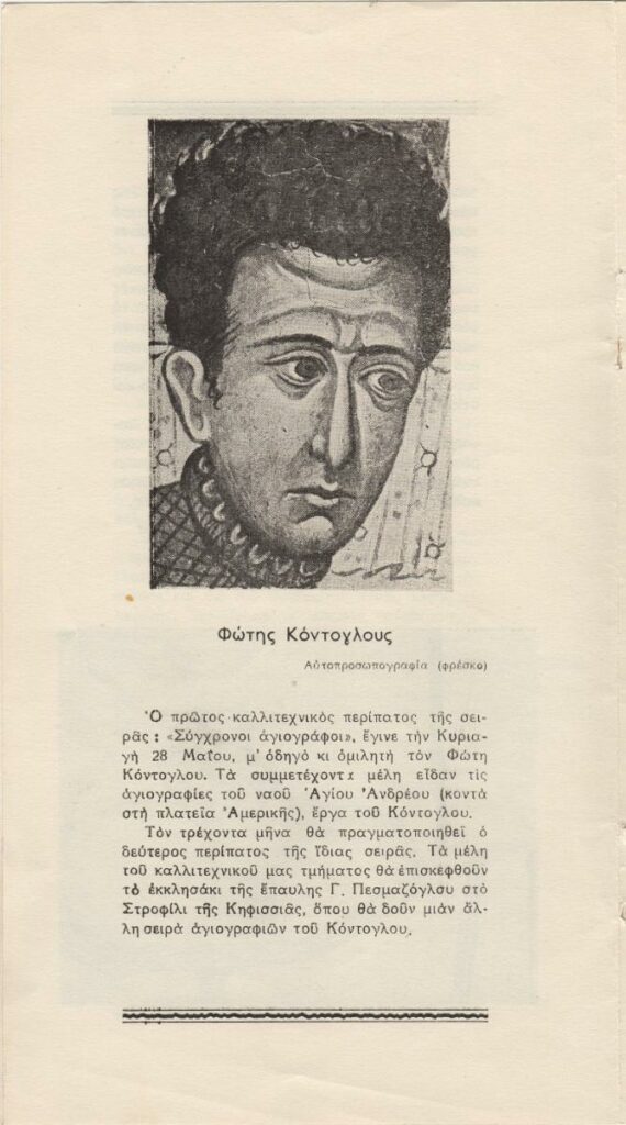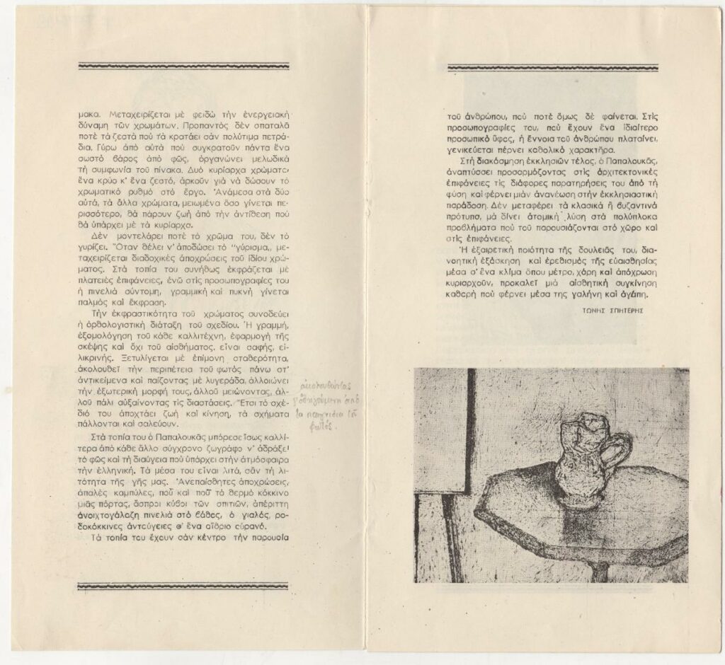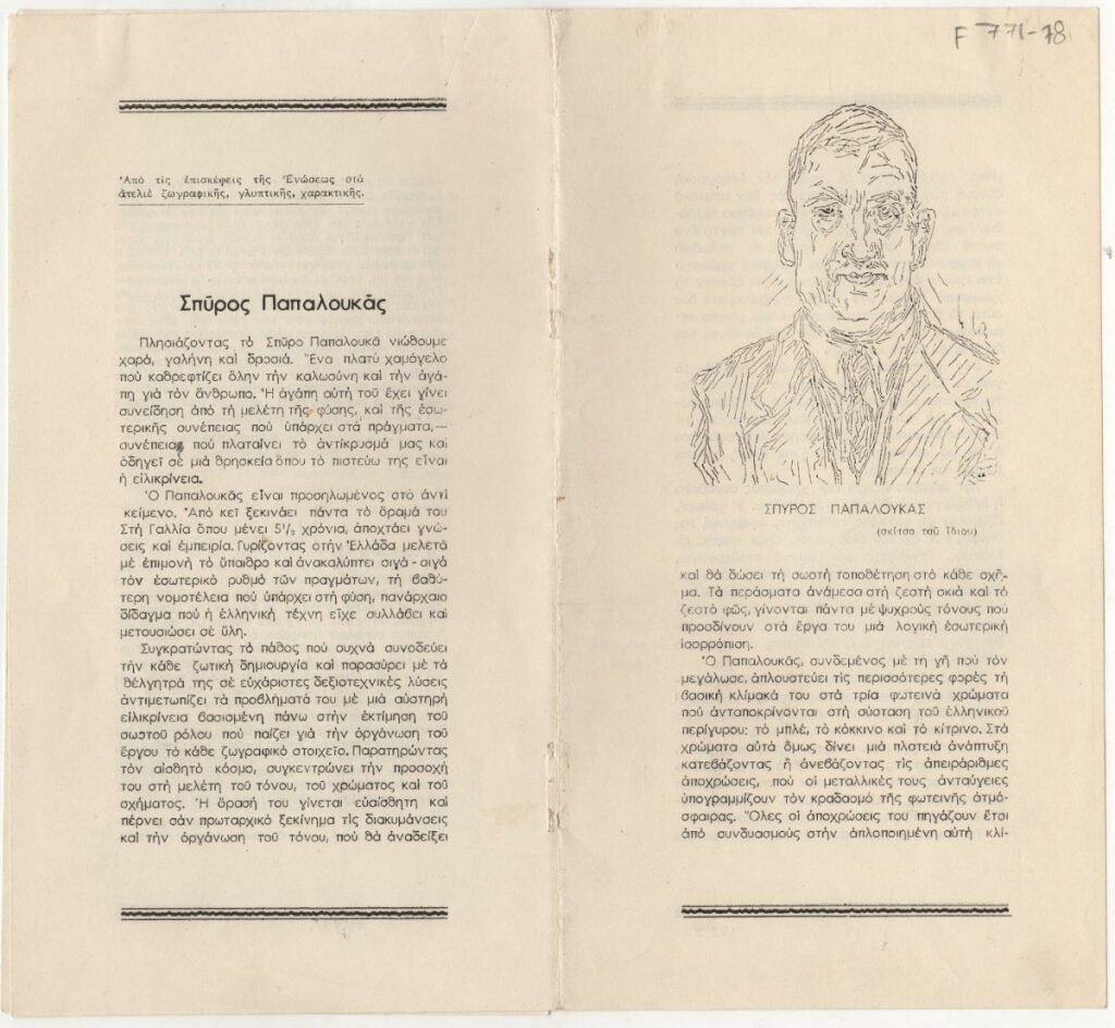 Έντυπο δημοσίευσης κειμένου του Τώνη Σπητέρη για τον Σπύρο Παπαλουκά. Στο ίδιο, κείμενο που αναφέρεται σε ομιλία του Φώτη Κόντογλου, από αφιέρωμα με τίτλο “Σύγχρονοι αγιογράφοι”.