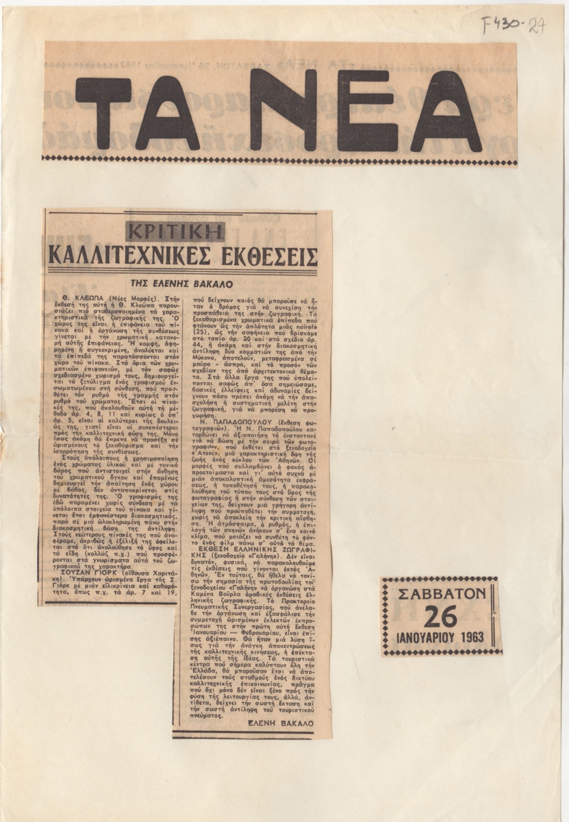 Χαρτί, 29×21 εκ., με κολλημένα αποκόμματα εντύπου, στα ελληνικά, δημοσίευσης κριτικών εκθέσεων. Ειδικότερα, σχολιάζονται αυτές των Θάλειας Κλεώπα, Susan York, Ν. Παπαδόπουλου και η έκθεση Ελληνικής Ζωγραφικής. Εντάσσεται στην ομώνυμη στήλη του εντύπου.