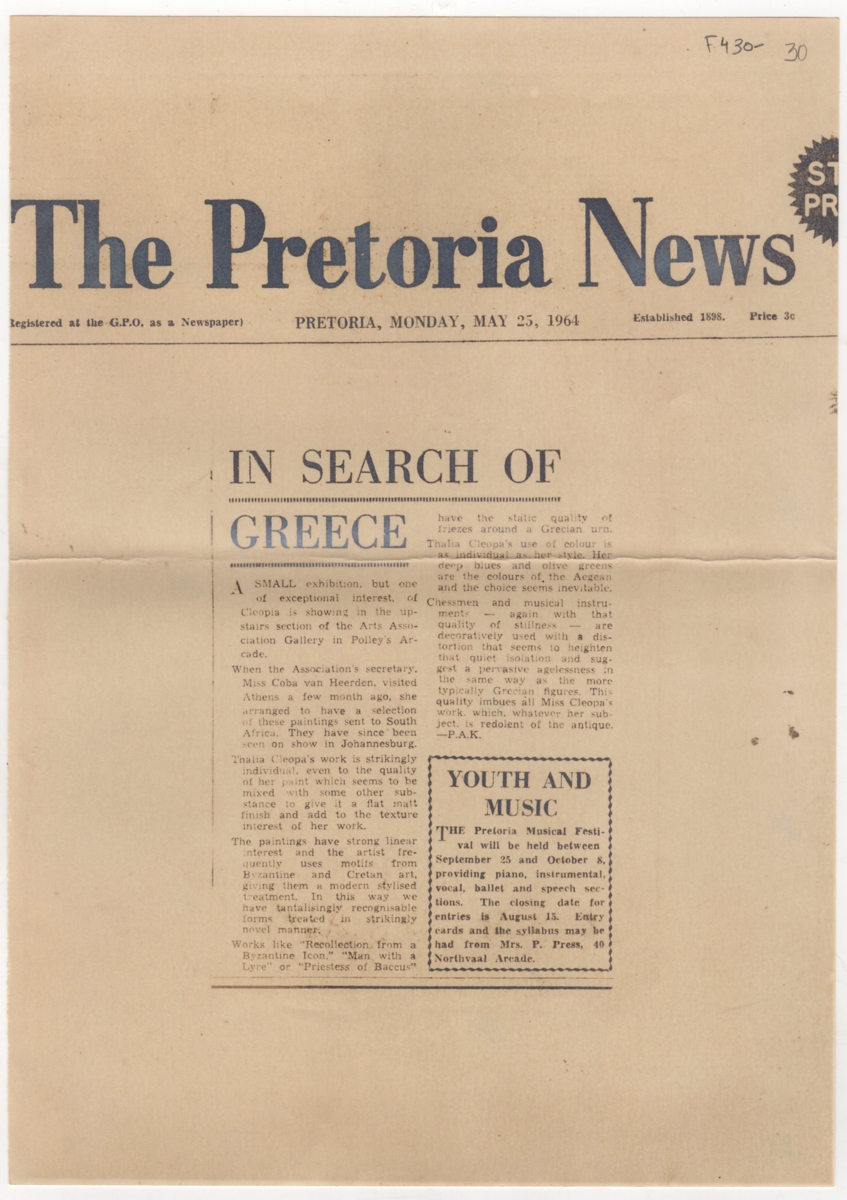 Φωτοαντίγραφο, χαρτί, 29×21 εκ., στα αγγλικά, δημοσίευσης κριτικής ατομικής έκθεσης της Θάλειας Κλεώπα στην Πρετόρια.