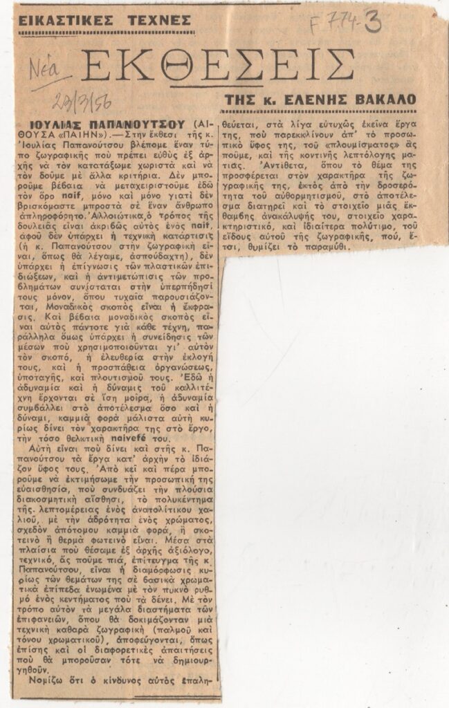 Απόκομμα, χαρτί, 16,5×10 εκ., στα ελληνικά, δημοσίευσης κριτικής έκθεσης της Ιουλίας Παπανούτσου, η οποία διεξάγεται στην Αίθουσα Πέην, στην Αθήνα.