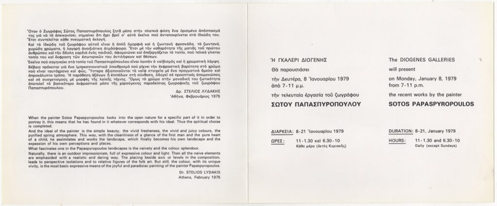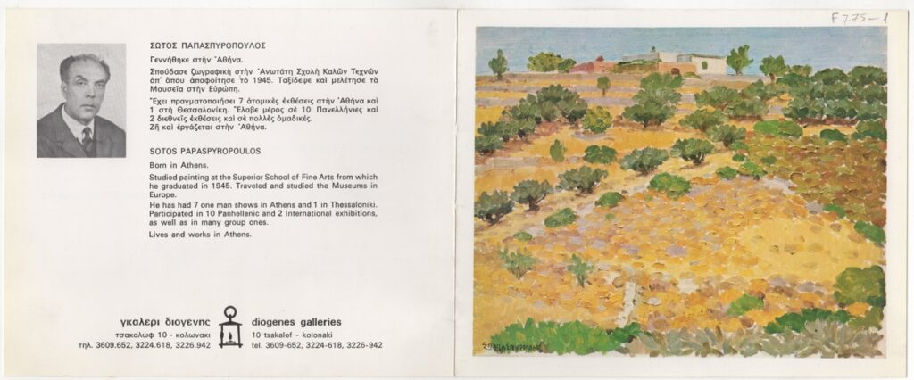 Πρόσκληση, χαρτόνι, 16×20 εκ., στα ελληνικά και αγγλικά, εγκαινίων έκθεσης του Σώτου Παπασπυρόπουλου. Περιέχει βιογραφικό σημείωμα, κριτική του Στέλιου Λυδάκη και εικονογράφηση.