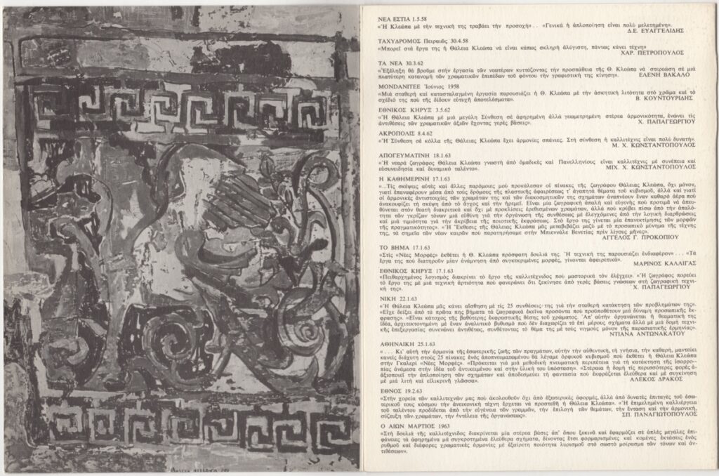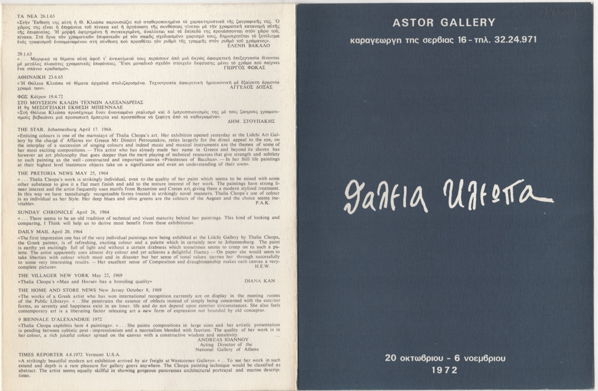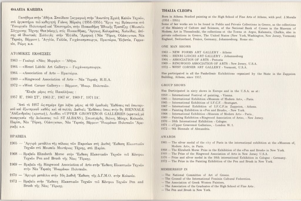 Έντυπο, χαρτόνι δίπτυχο, 24×18 εκ., στα ελληνικά και αγγλικά, ατομικής έκθεσης ζωγραφικής της Θάλειας Κλεώπα. Περιέχει βιογραφικό της καλλιτέχνιδας, λίστα εκθέσεων, βραβεία, αποσπάσματα κριτικών στον Τύπο και εικονογράφηση.