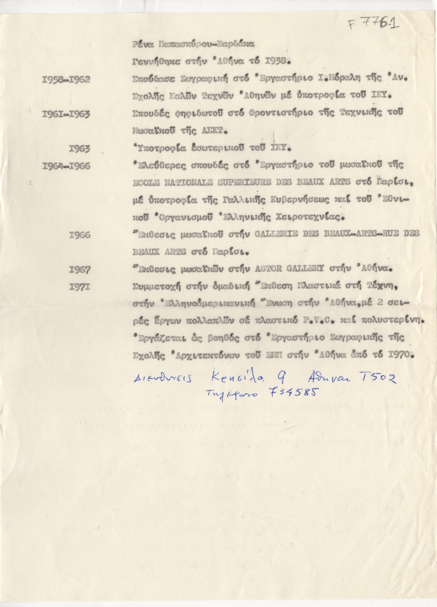 Βιογραφικό, δακτυλόγραφο, ριζόχαρτο, 29×21 εκ., στα ελληνικά, της Ρένας Παπασπύρου-Βαρδάκα.