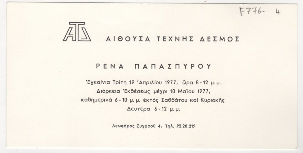 Πρόσκληση, χαρτόνι, 10×20 εκ., στα ελληνικά, εγκαινίων ατομικής έκθεσης της Ρένας Παπασπύρου.