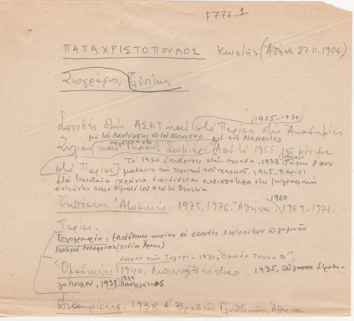 Βιογραφικό, χειρόγραφο, χαρτί, 18×21 εκ., στα ελληνικά, του Κωστή Παπαχριστόπουλου.