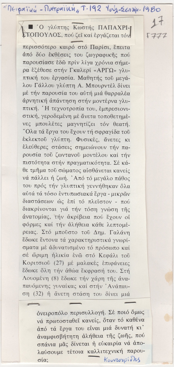Αποκόμματα συρραμμένα σε έντυπο συν. διαστάσεων 21×10 εκ., χαρτί, στα ελληνικά, δημοσίευσης κριτικής έκθεσης του Κώστα Παπαχριστόπουλου, η οποία διεξάγεται στην Γκαλερί Αργώ, στην Αθήνα. Δίνονται πληροφορίες για τις σπουδές του καλλιτέχνη.
