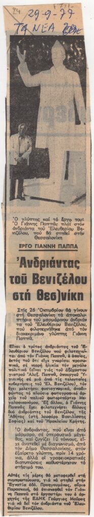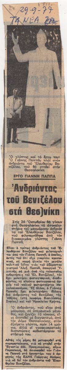 Απόκομμα, χαρτί, 30×5 εκ., στα ελληνικά, δημοσίευσης άρθρου αναφερόμενου σε ανδριάντα του Ελευθέριου Βενιζέλου, του Γιάννη Παππά, στη Θεσσαλονίκη.
