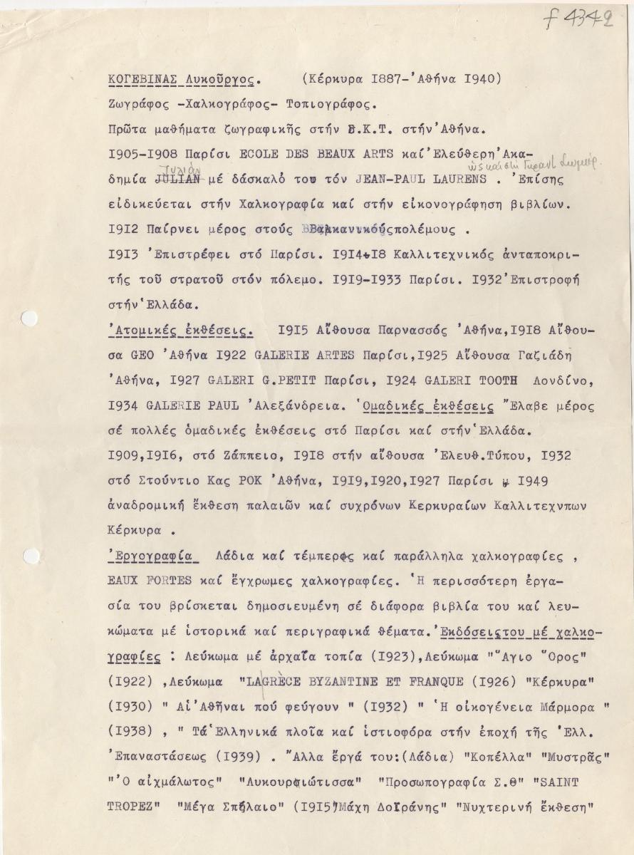 Δακτυλόγραφο κείμενο με πληροφορίες βιογραφικού για τον ζωγράφο Λυκούργο Κογεβίνα. Περιέχει προσωπικές πληροφορίες, ατομικές εκθέσεις, εργογραφία και βιβλιογραφία.