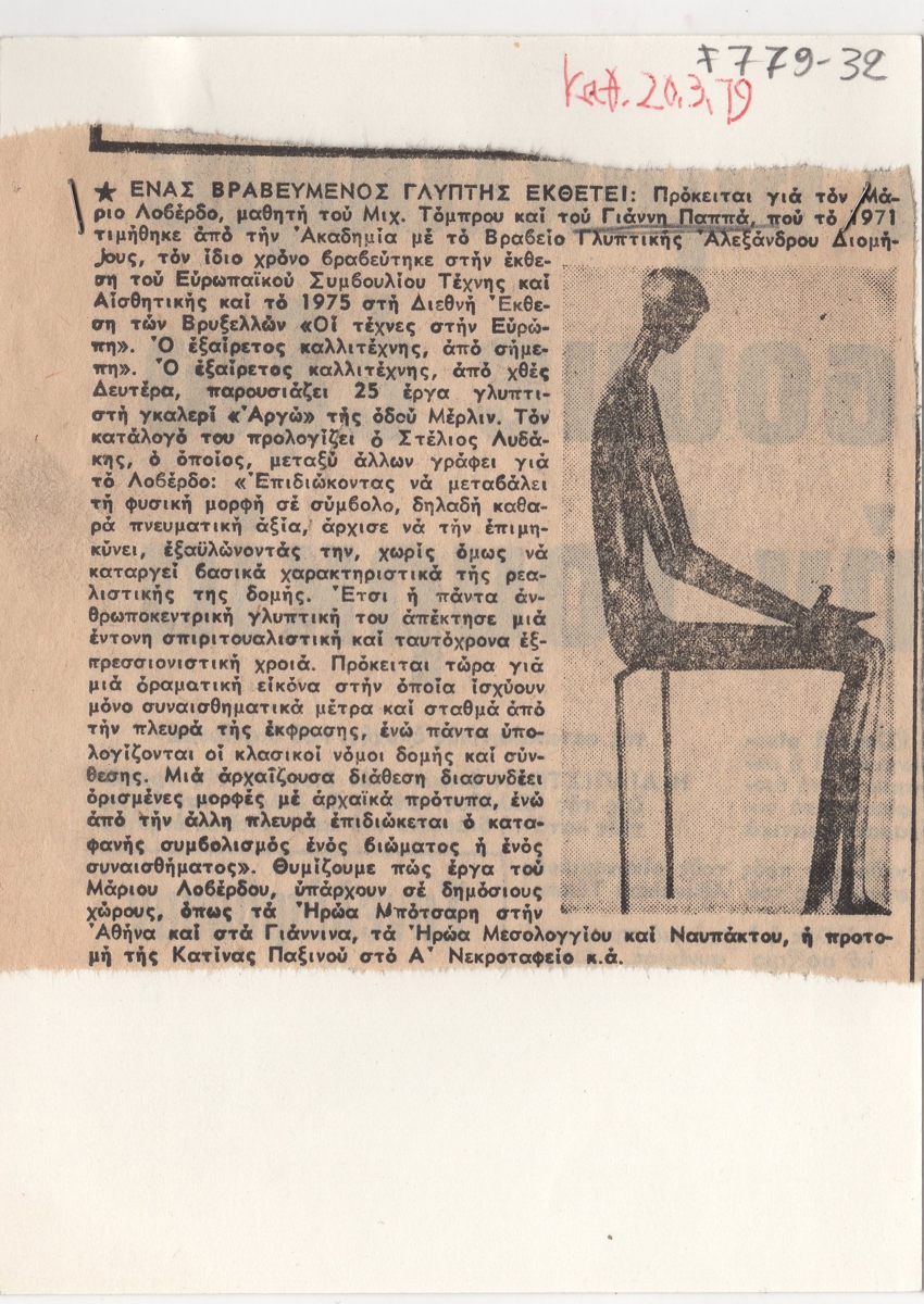 Απόκομμα, χαρτί, 15×12 εκ., στα ελληξνικά, δημοσίευσης άρθρου αναφερόμενου στον Μάριο Λοβέρδο, μαθητή των Γιάννη Παππά και Μιχάλη Τόμπρου. Σχολιάζεται έκθεσή του στην Γκαλερί Αργώ.