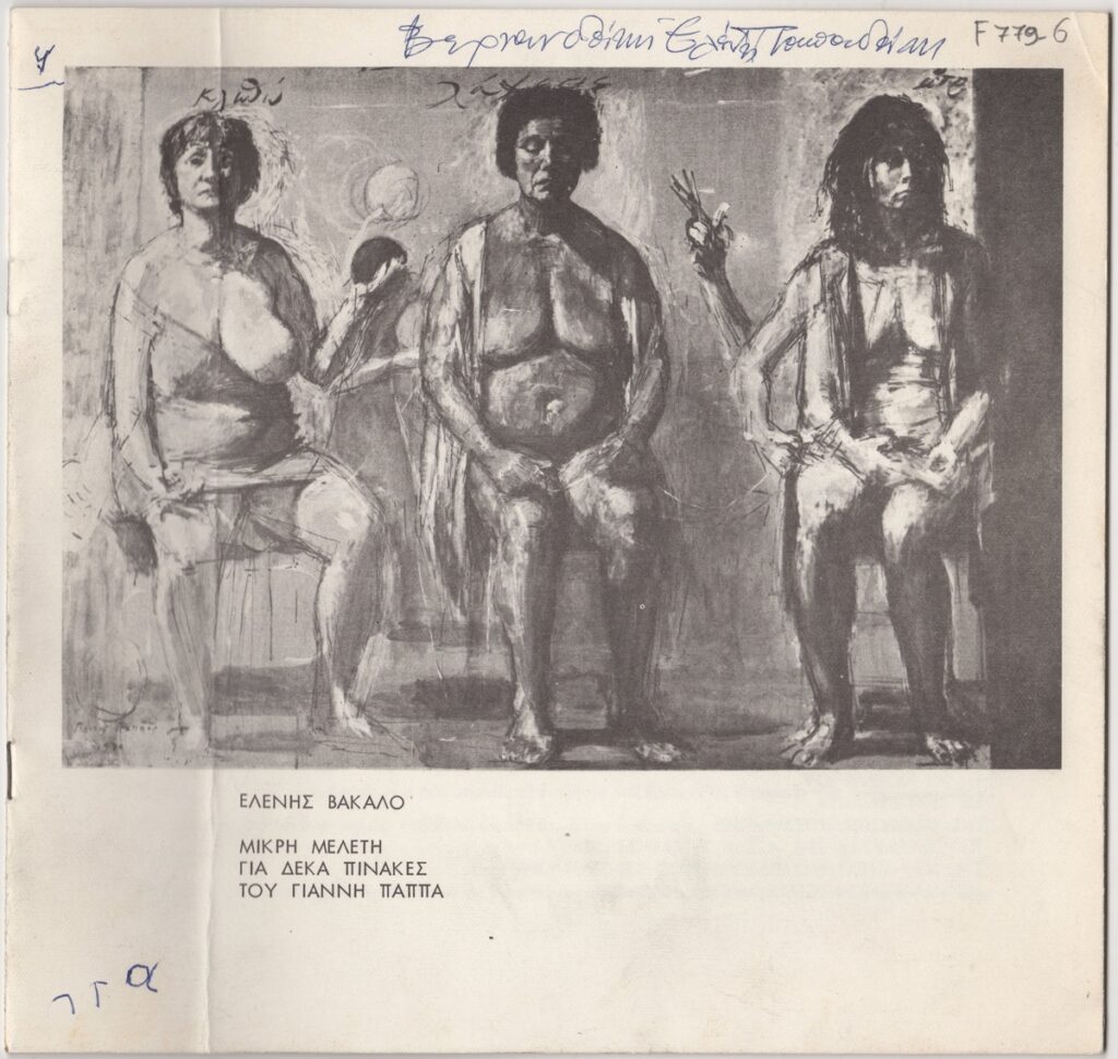 Έντυπο, χαρτόνι, 3 φφ, 22,5×23,5 εκ., στα ελληνικά, που περιέχει μελέτη της Ελένης Βακαλό για δέκα έργα του Γιάννη Παππά.