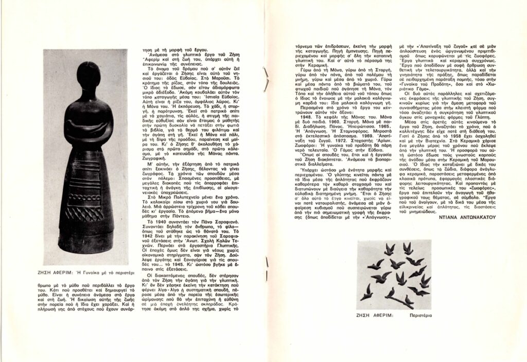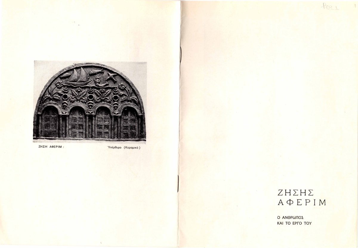 Έντυπο, χαρτί ιλλουστρασιόν, 4 φφ, 23,5×17 εκ. στα ελληνικά για τον Ζήση Άφεριμ. Περιλαμβάνει κείμενο για τον καλλιτέχνη από την Ντιάνα Αντωνακάτου και εικονογράφηση.