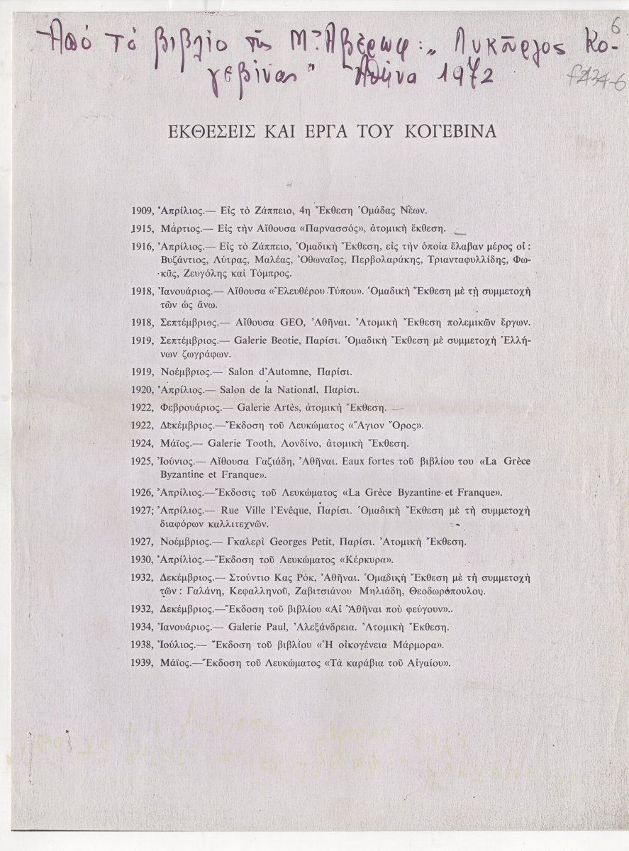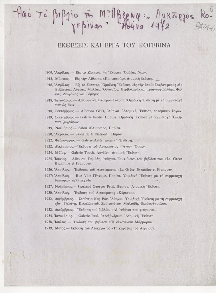 Φωτοαντίγραφο, χαρτί, 28×21 εκ., στα ελληνικά, με λίστα εκθέσεων και έργων του Λυκούργου Κογεβίνα της περιόδου 1909-1939.