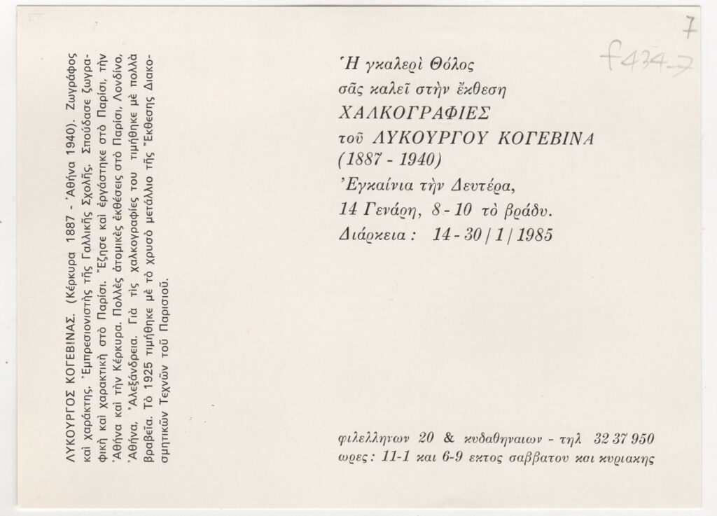 Πρόσκληση, χαρτί διπλής όψης, 12,5×16,5 εκ., στα ελληνικά, εγκαινίων αναδρομικής έκθεσης του Λυκούργου Κογεβίνα, στην Γκαλερί Θόλος στην Αθήνα.