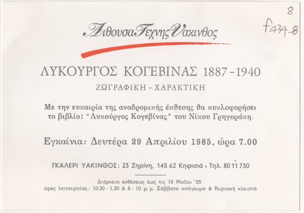 Πρόσκληση, χαρτόνι, 12×17 εκ., στα ελληνικά, εγκαινίων αναδρομικής έκθεσης ζωγραφικής και χαρακτικής του Λυκούργου Κογεβίνα.