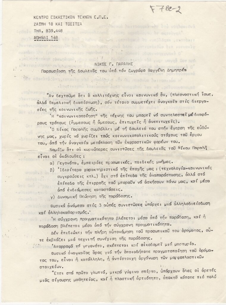Κείμενο, χαρτί διπλής όψης, δακτυλόγραφο, 28,5×21 εκ., στα ελληνικά, του Βαγγέλη Δημητρέα για το εικαστικό έργο του Νίκου Παραλή.