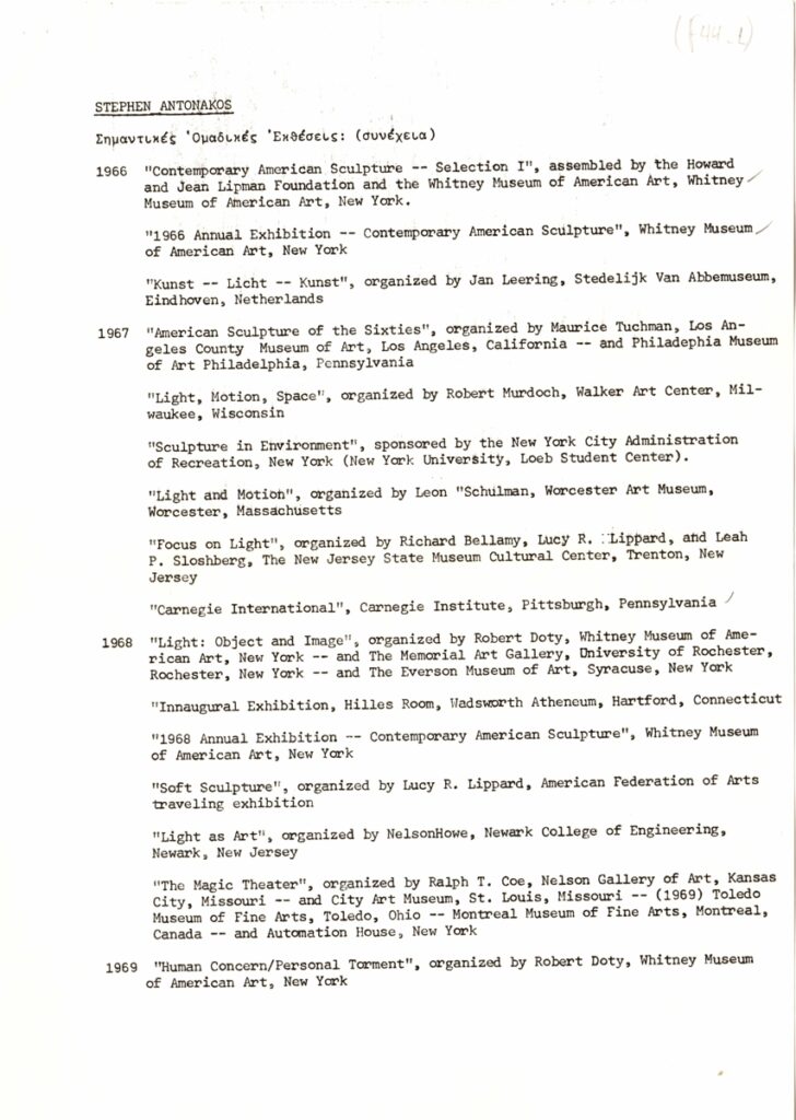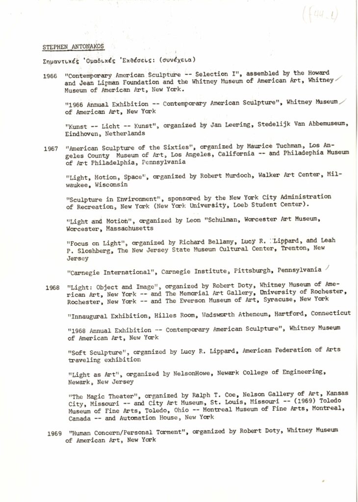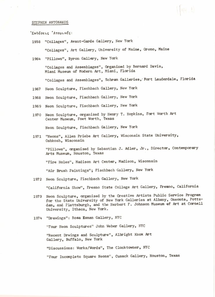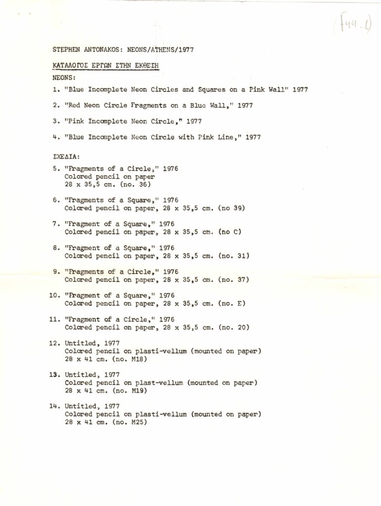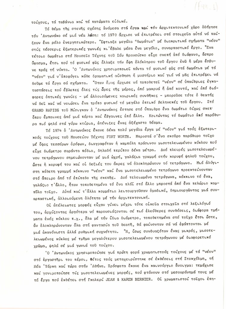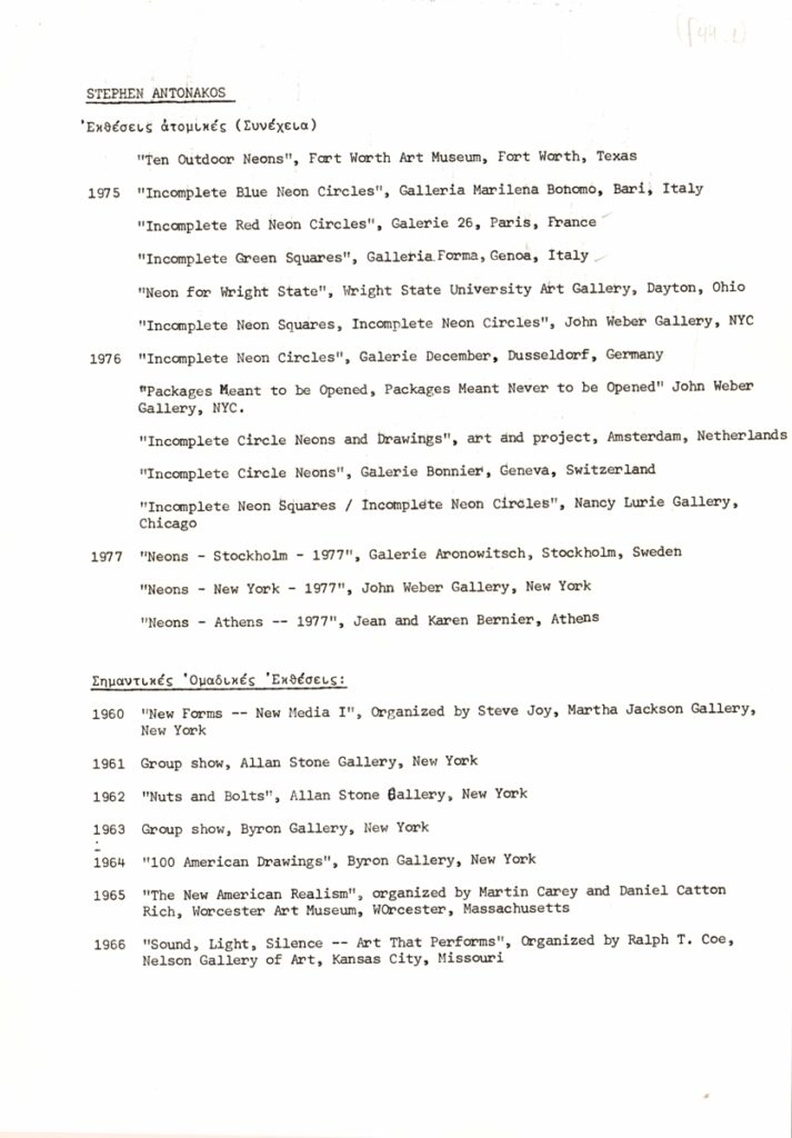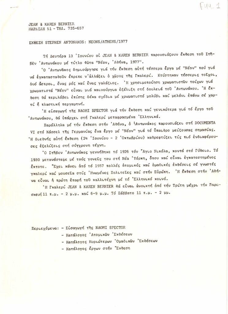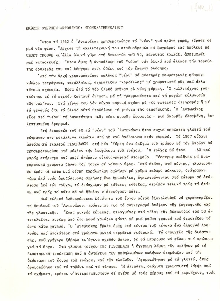 Δελτίο Τύπου, δακτυλόγραφο, χαρτί, 9 φφ, 30×21εκ, στα ελληνικά, ατομικής έκθεσης του Stephen Antonakos, με τίτλο “Neons/Athens/1977”. Περιέχει κείμενο της Naomi Spector σε μετάφραση Μπέμπας Κλερίδη για τον καλλιτέχνη και το έργο του, λίστα ατομικών και ομαδικών εκθέσεων ανά χρονολογία και κατάλογο έργων.