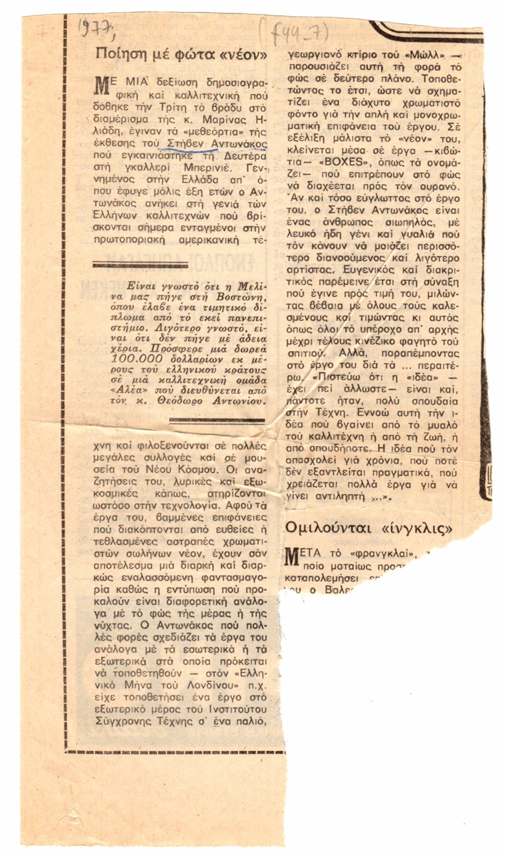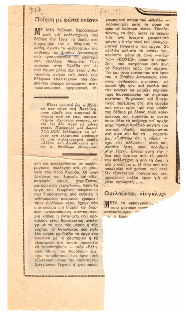 Απόκομμα, χαρτί, 12×21,5εκ, στα ελληνικά, δημοσίευσης άρθρου για το έργο του Στήβεν Αντωνάκου, με αφορμή ατομική του έκθεση στην γκαλερί Μπερνιέ.