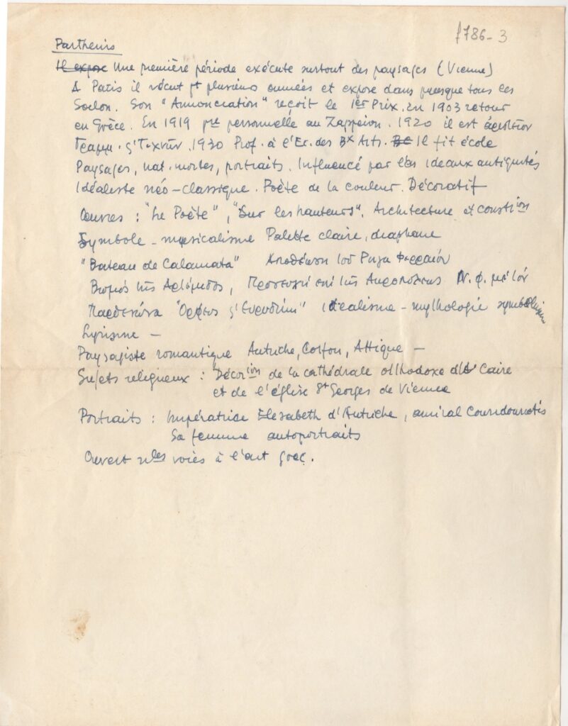Κείμενο, χειρόγραφο, χαρτί, 27×21 εκ., στα γαλλικά, για τον Κωνσταντίνο Παρθένη αναφερόμενο στο εικαστικό έργο του. Δίνονται έργα του.
