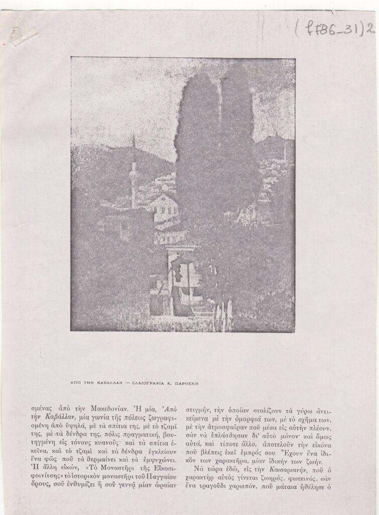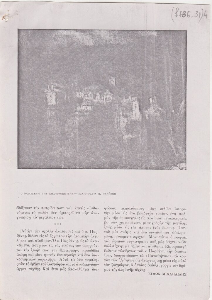 Φωτοαντίγραφο αποκόμματος, χαρτί, 4 φφ, 18,5×13,5 εκ., στα ελληνικά, δημοσίευσης άρθρου αναφερόμενου στο εικαστικό έργο του Κωνσταντίνου Παρθένη.